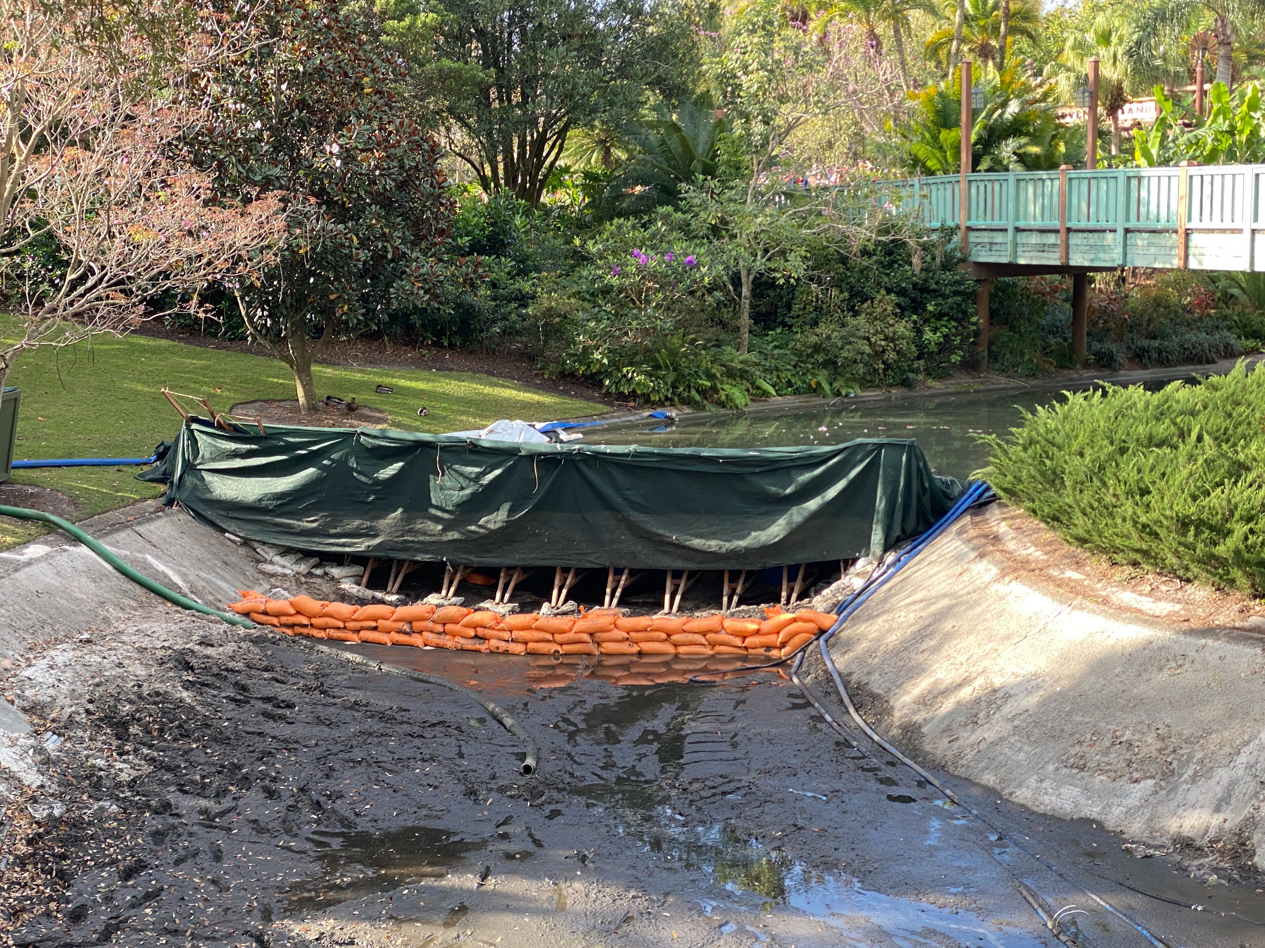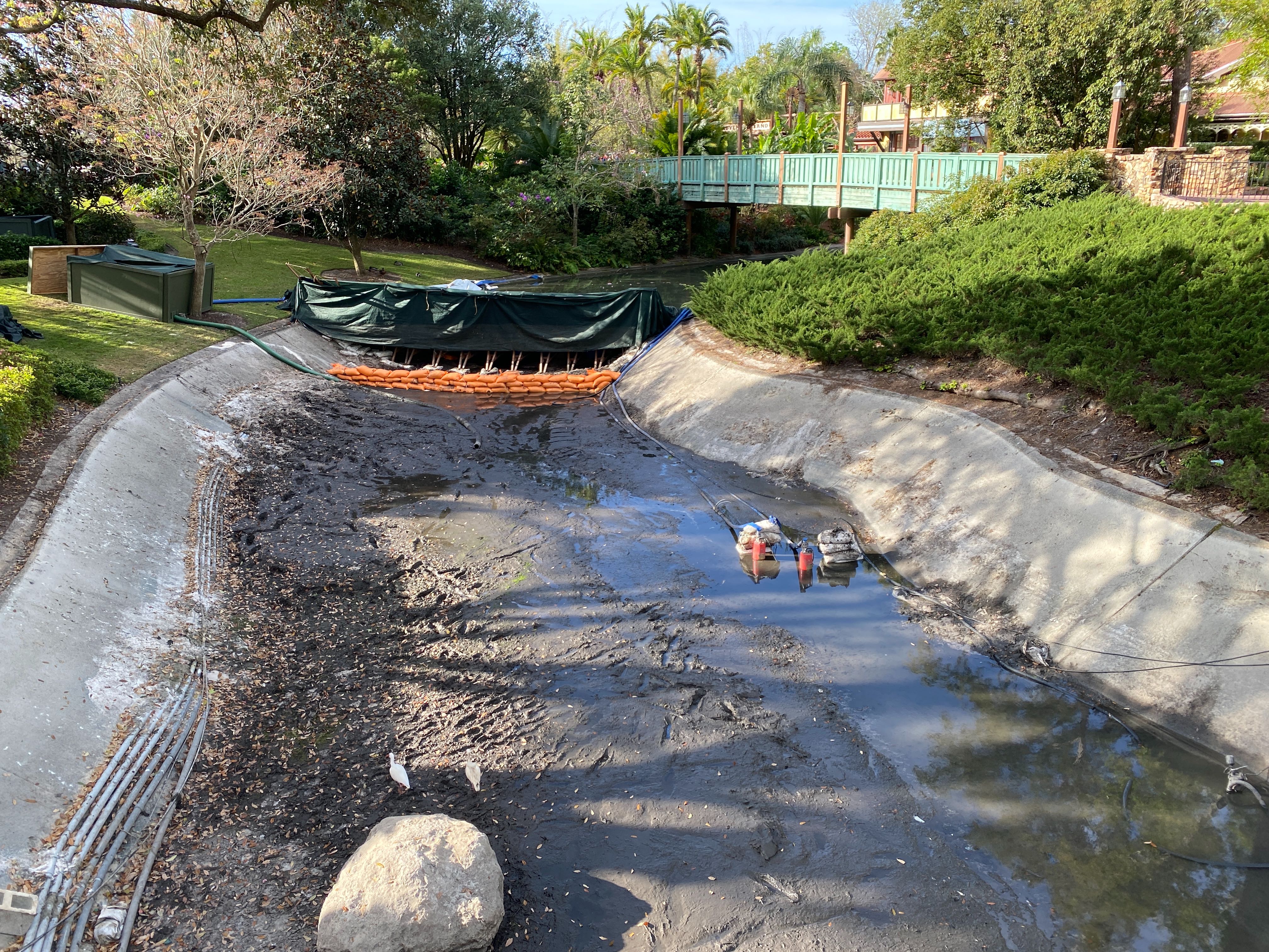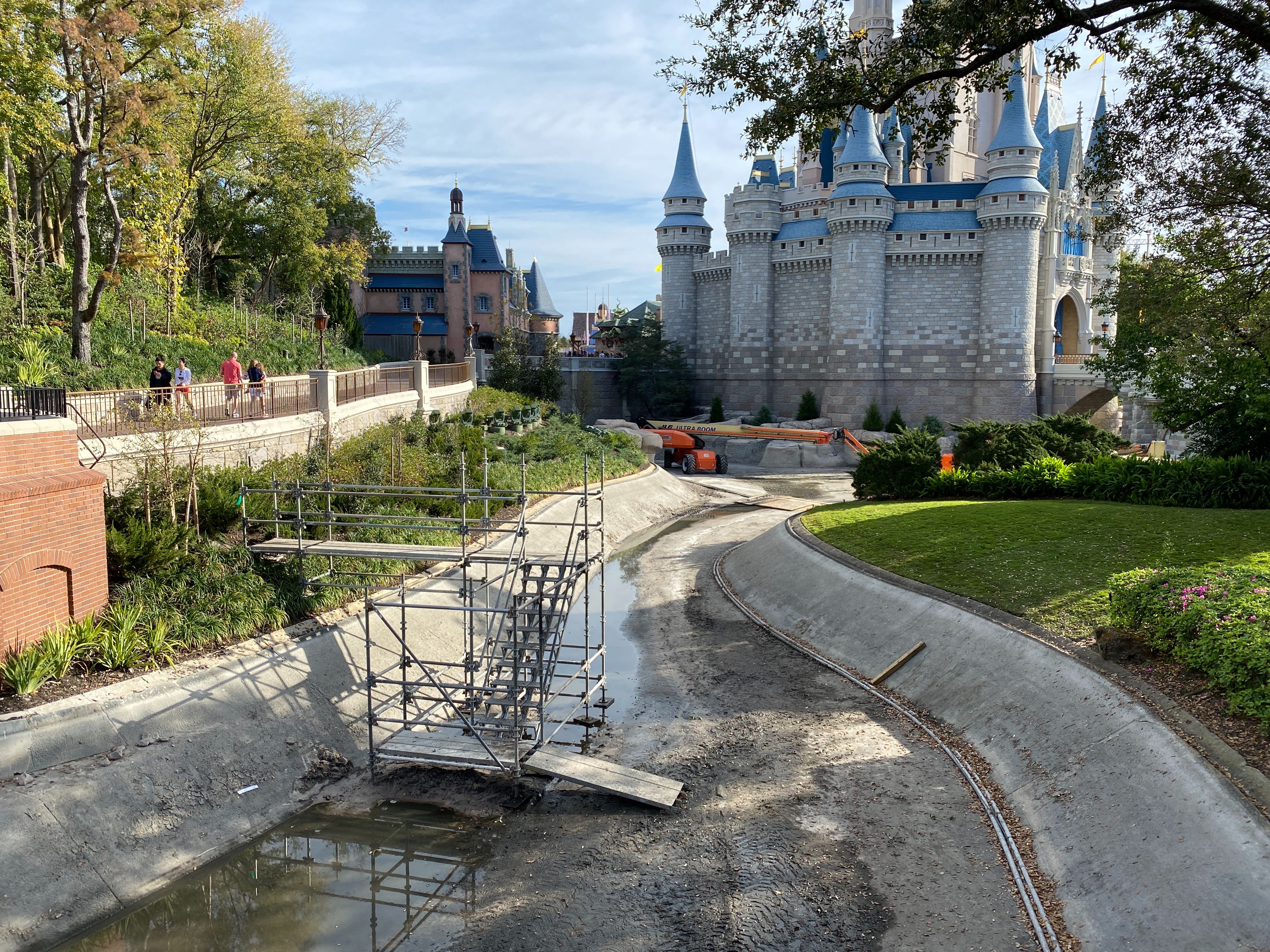 In what for a long time seemed like watching paint dry, we actually have some obvious change present in the Cinderella Castle moat. For much of the last two weeks, we have been tracking the progress of the moat draining. Cinderella Castle is being drained of its moat because of the upcoming makeover of the castle facade.