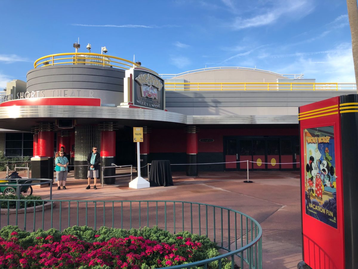 It’s a big day at Disney’s Hollywood Studios, as construction walls are down at the Mickey Shorts Theater, revealing its bright red entrance dotted with animated posters. Take a look at the new theater below!