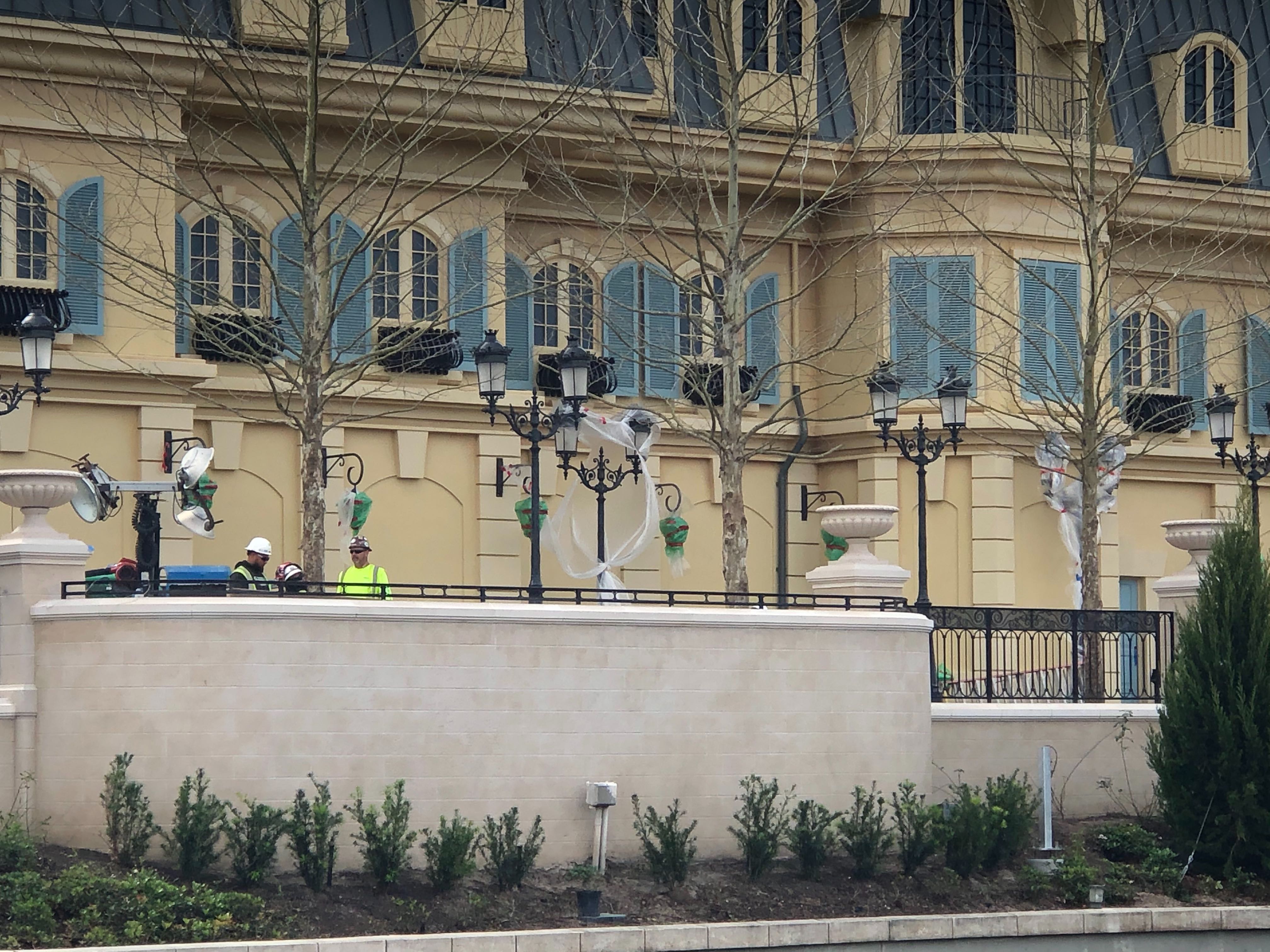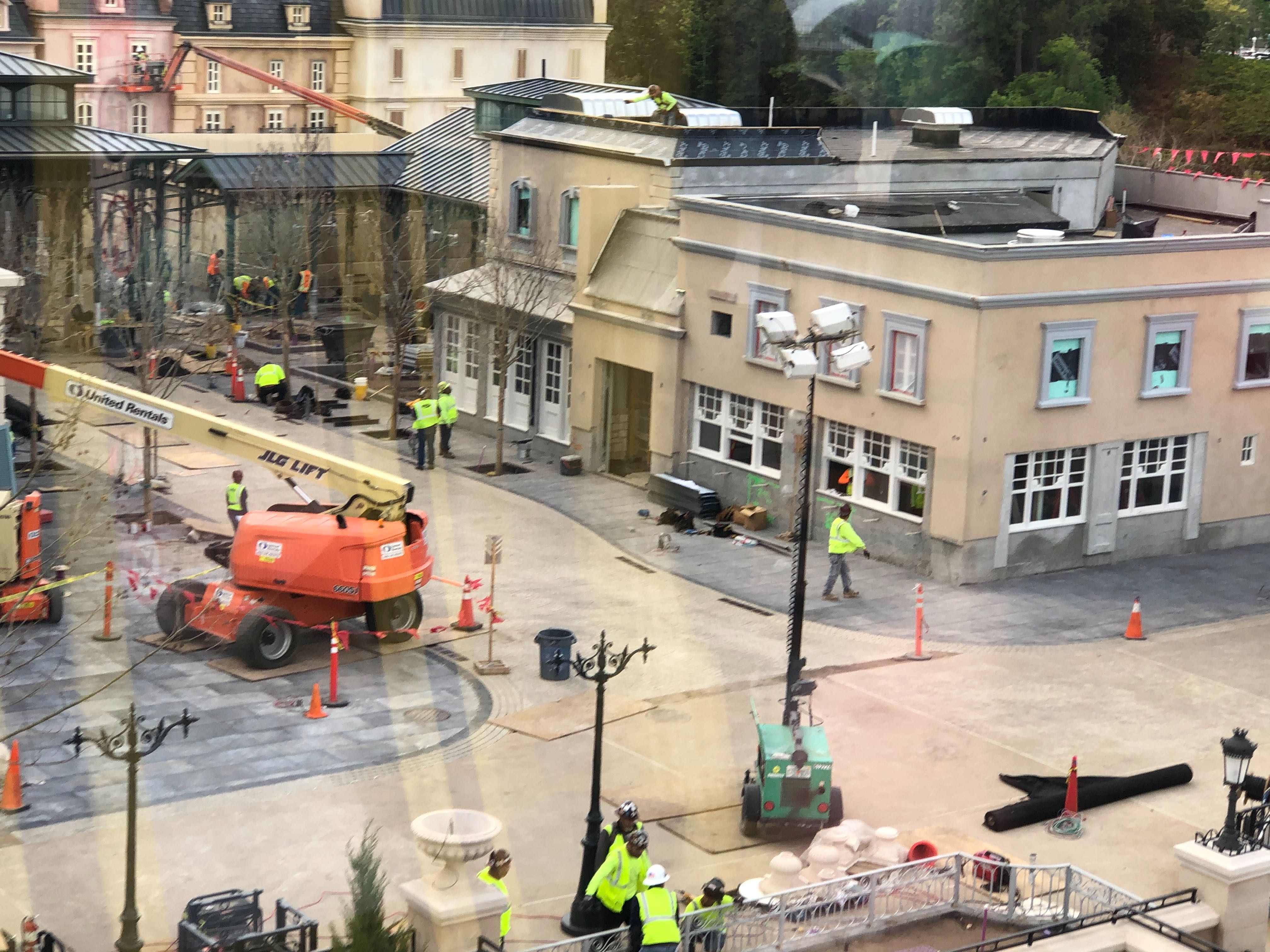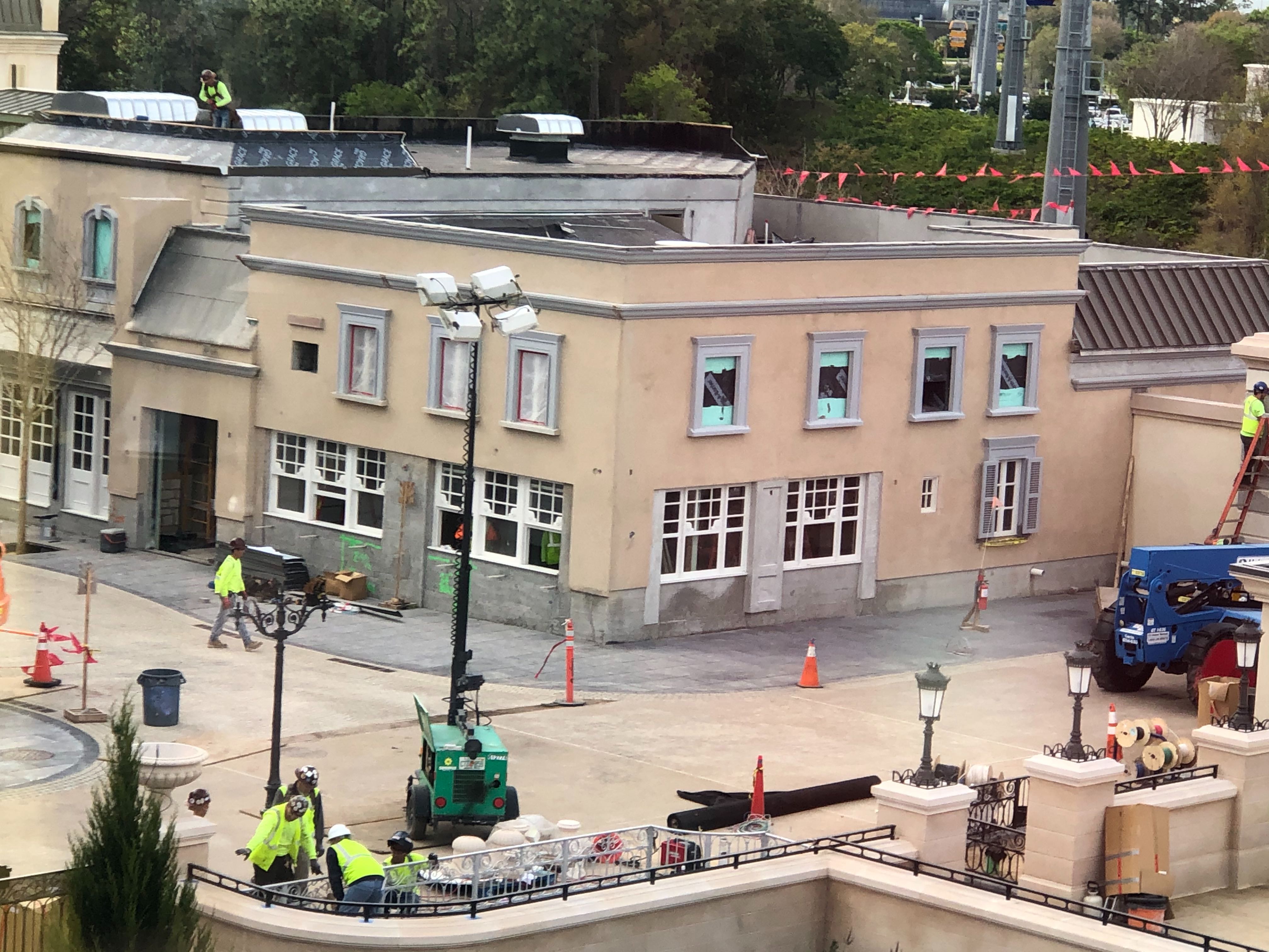 As we got over the job site, we could tell some facade work had been done on the closest buildings to the Disney Skyliner in the last couple of days. Here, we see that the Creperie de Paris is nearly completed––at least on the outside, that is.