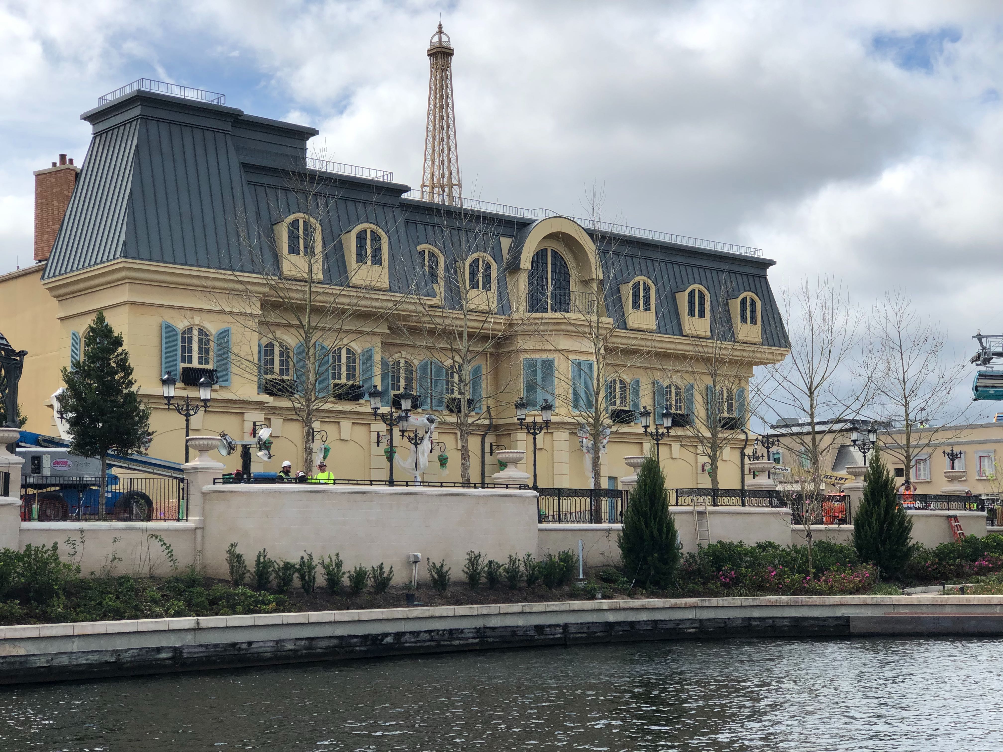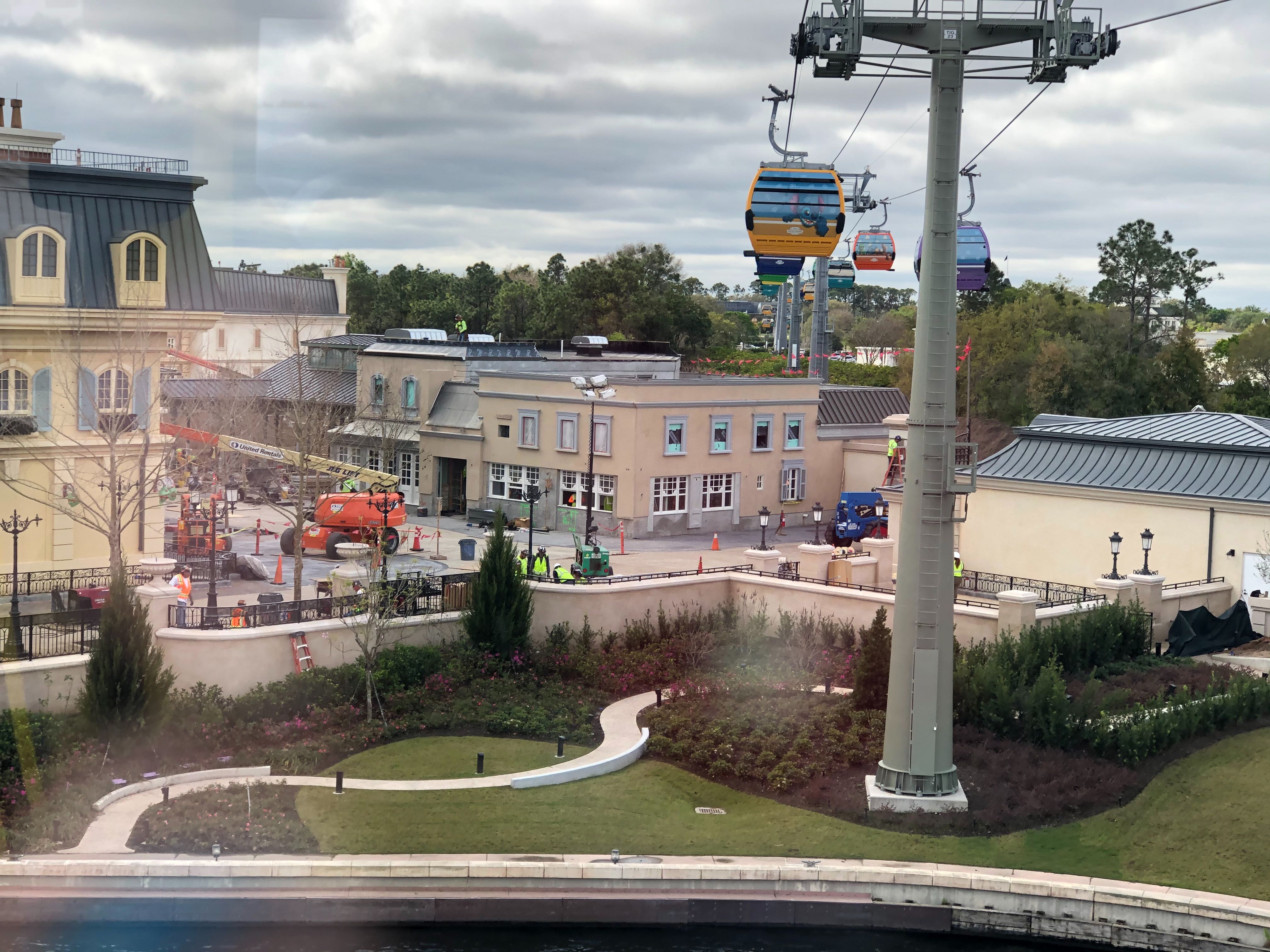In the shadows of the EPCOT International Flower & Garden Festival, work is progressing all over the France Pavilion in the lead-up to the grand opening of Remy’s Ratatouille Adventure later this summer. We saw the entrance arch installed just a couple days ago, and on our Disney Skyliner jaunt this morning, we saw even more!