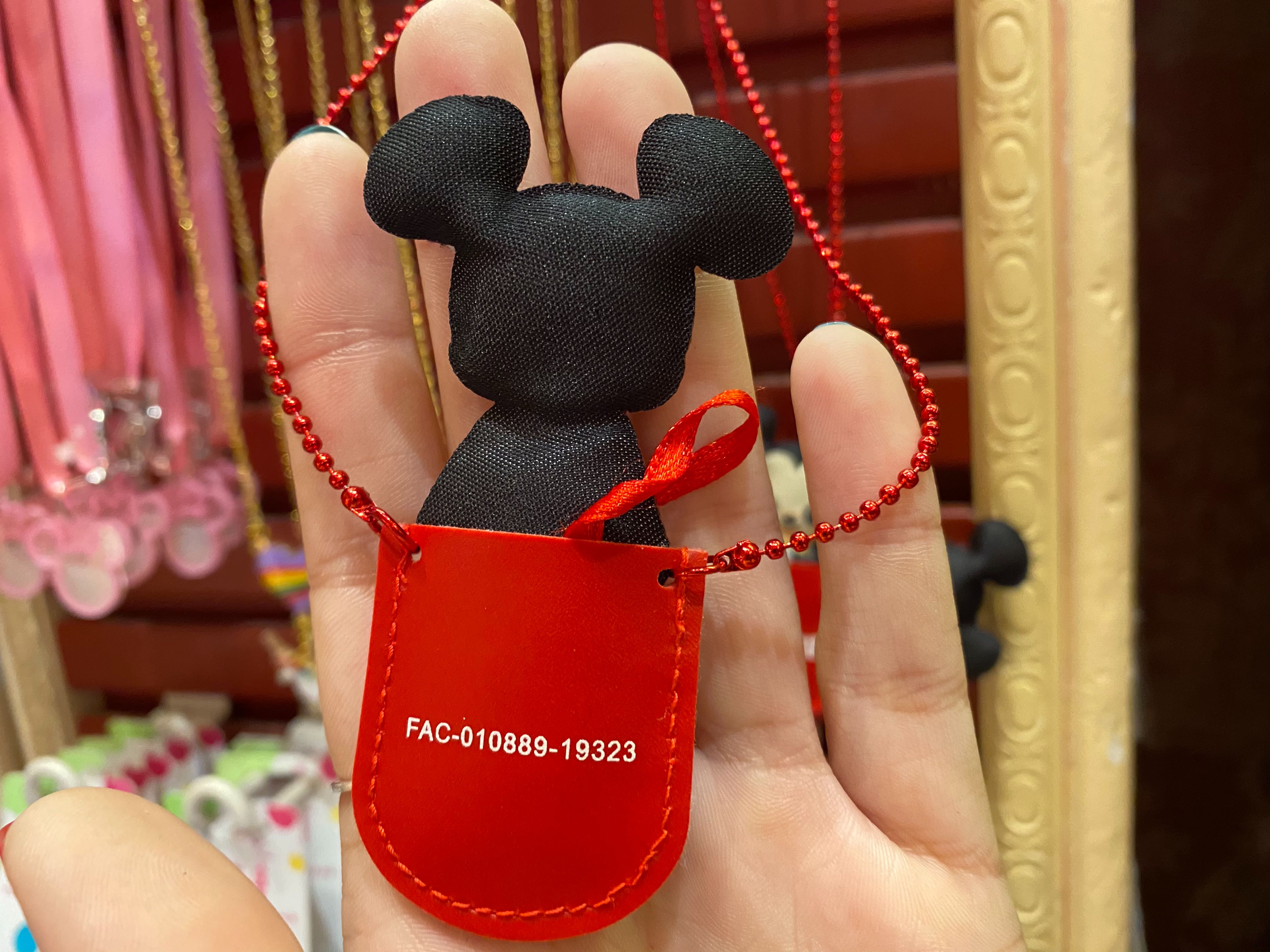 This red chain necklace actually has a tiny little pocket, and sitting inside is an adorable mini Mickey Wishables plush. This is a perfect necklace for carrying around a tiny mascot, either for luck or to keep all of your wishes safe.