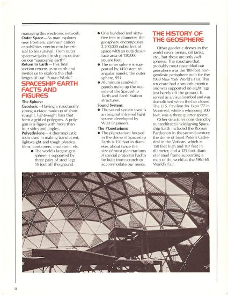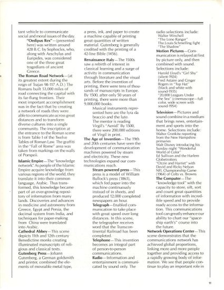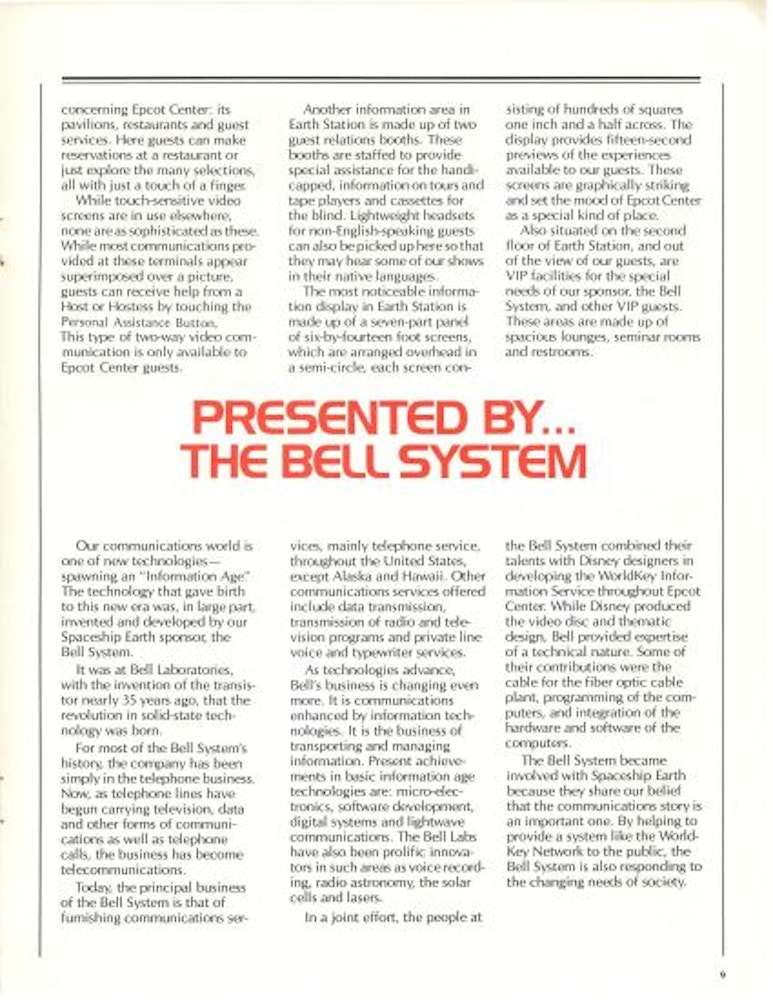 This ultimate result of the communications revolution also the message of Spaceship Earth and [EPCOT] Center. Here, the need for global, person-to-person interaction is expressed. When our guests experience Spaceship Earth, they get a sampling of only a few of the means to make our world a global community.”