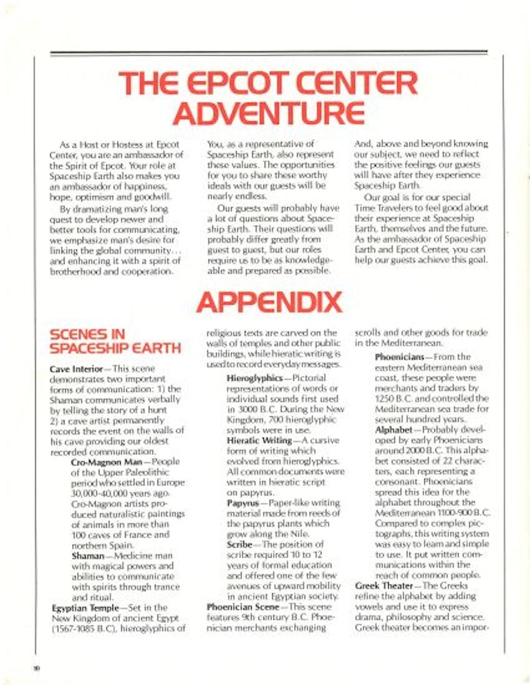 The booklet acts as a guide to the attraction and to EPCOT Center at large, offering a detailed description of the scenes guests would see in Spaceship Earth. It starts with a discussion of what EPCOT Center is supposed to represent: “a collective endeavor by people… for people, in the hope for a better world.”