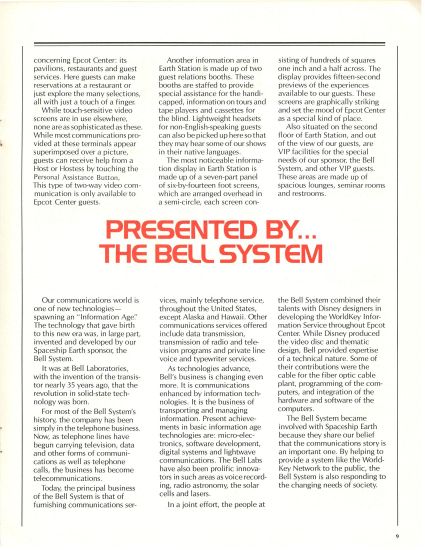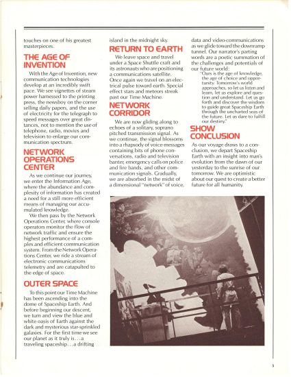 This ultimate result of the communications revolution also the message of Spaceship Earth and [EPCOT] Center. Here, the need for global, person-to-person interaction is expressed. When our guests experience Spaceship Earth, they get a sampling of only a few of the means to make our world a global community.”