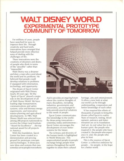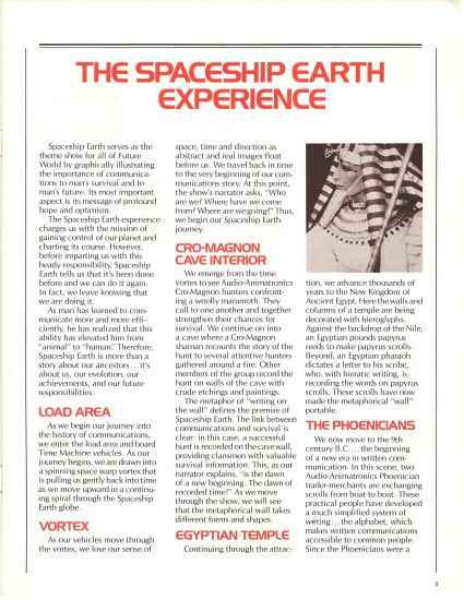 The booklet acts as a guide to the attraction and to EPCOT Center at large, offering a detailed description of the scenes guests would see in Spaceship Earth. It starts with a discussion of what EPCOT Center is supposed to represent: “a collective endeavor by people… for people, in the hope for a better world.”
