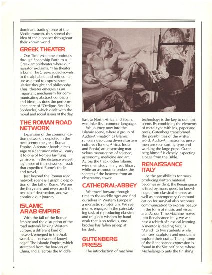 The booklet then goes on to describe the attraction, scene by scene. From the Cro-Magnon cave to the Phoenicians to the Renaissance to the Age of Invention and beyond, this offers a detailed explanation of the attraction.