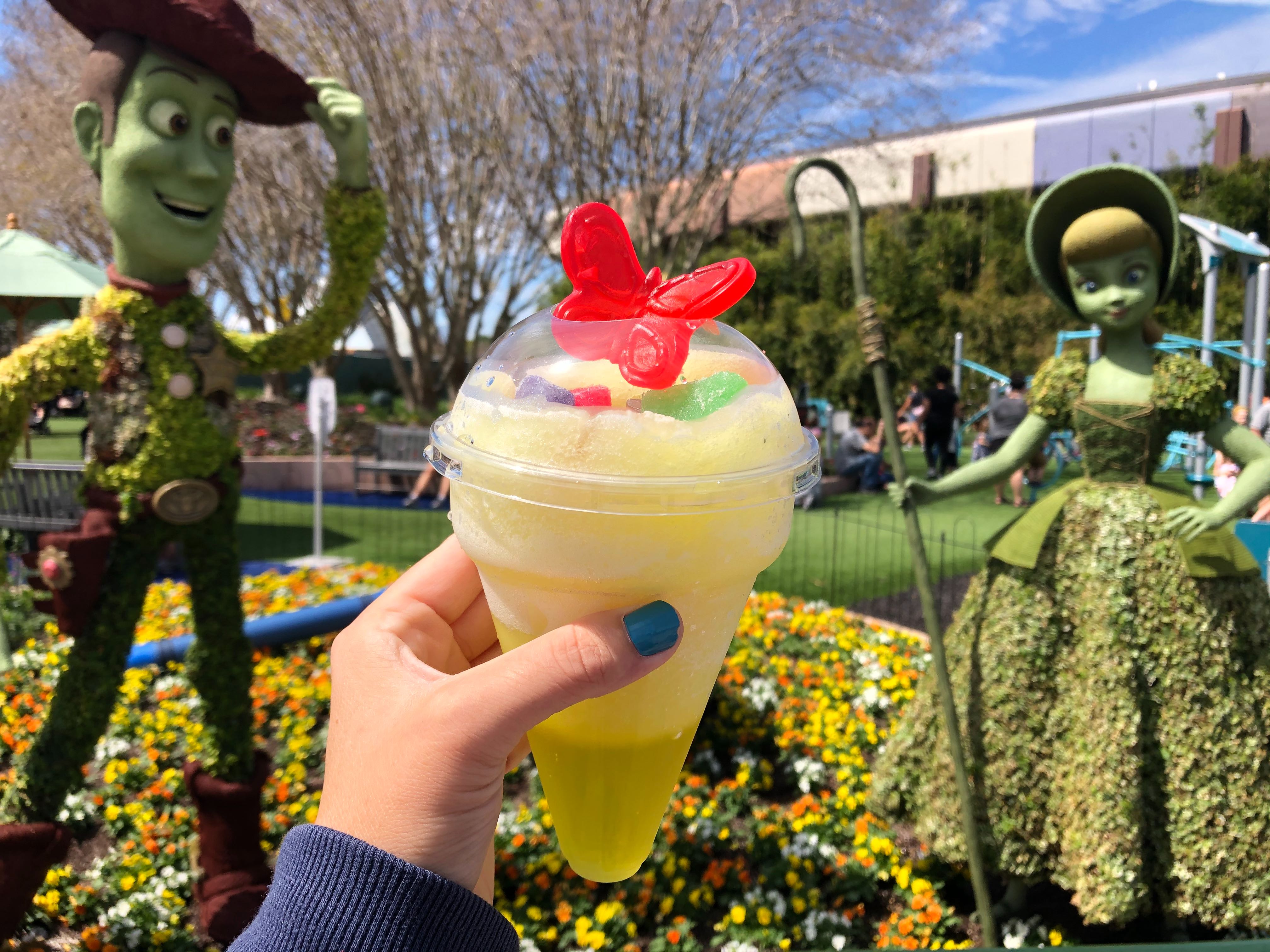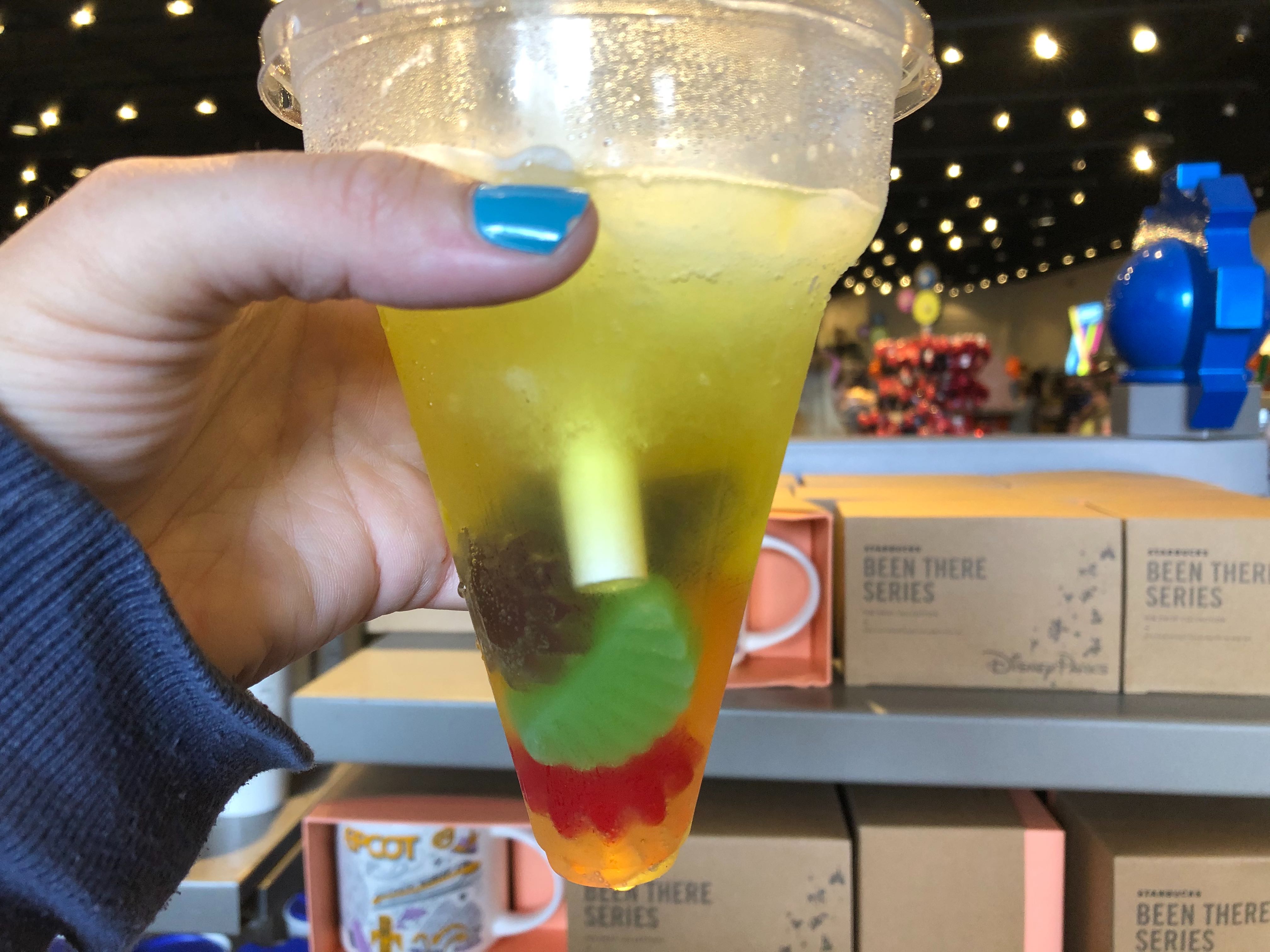 But, if you spend your time taking too many pictures, the gummies float to the bottom of the funnel-shaped cup. We thought the slush was good, but if you were looking for piña colada flavor, you will not find it here. We honestly thought it tasted more like an icy lime Dole Whip with a somewhat sour twist from the gummies. Overall, it did the job and cooled us off on this hot spring day!