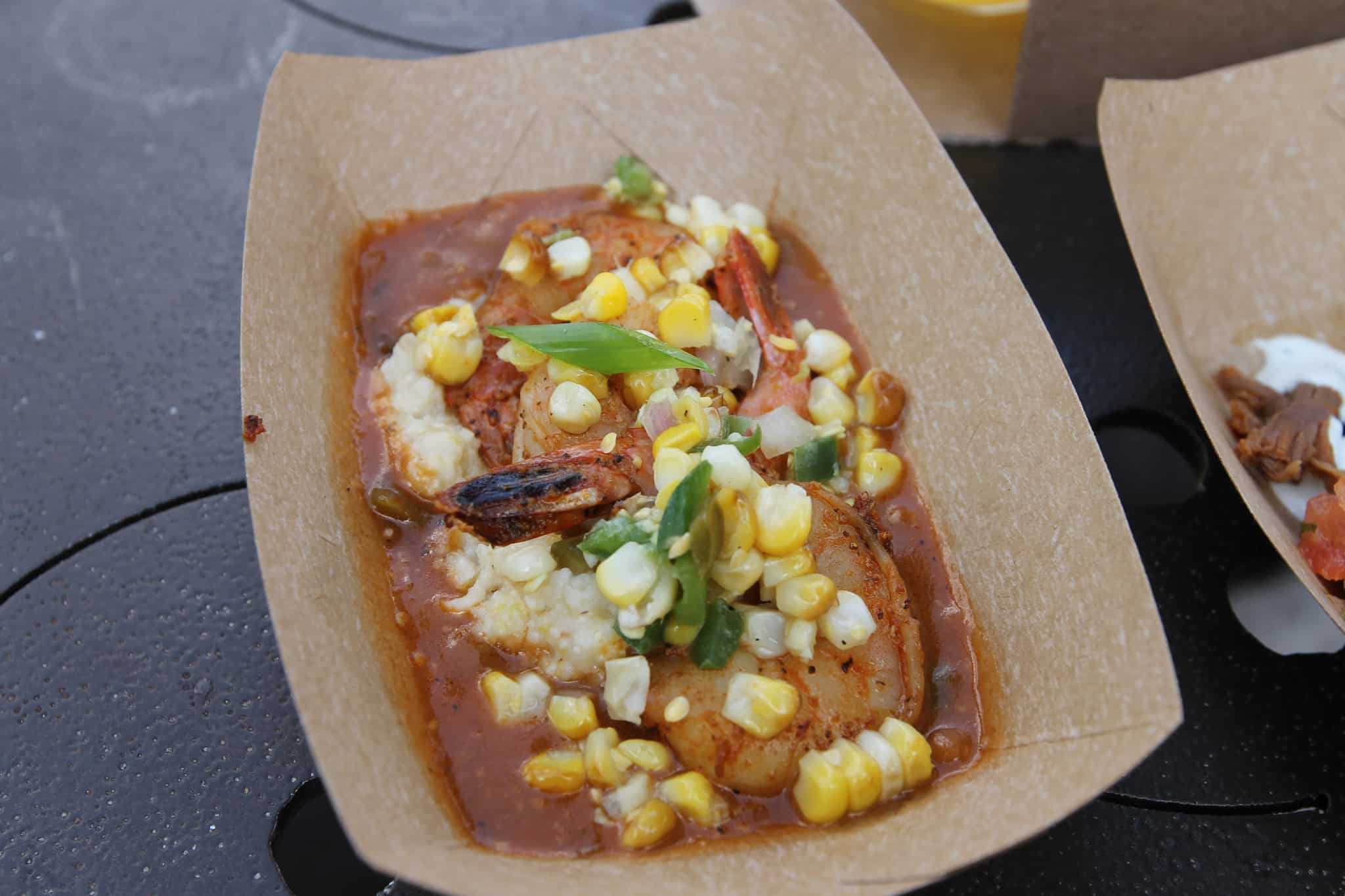 Spicy Blackened Shrimp and Cheddar Cheese Grits with Brown Gravy and Local Sweet Corn Relish – $7.25