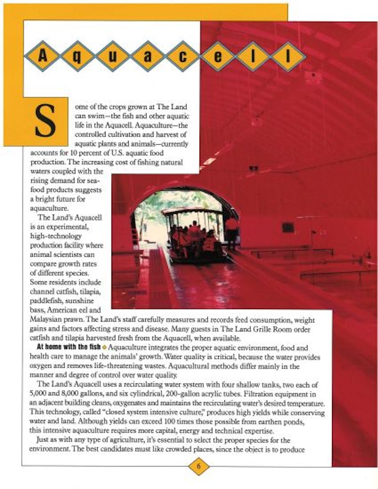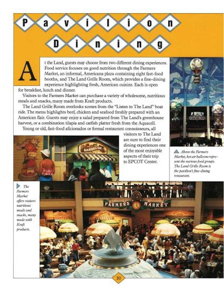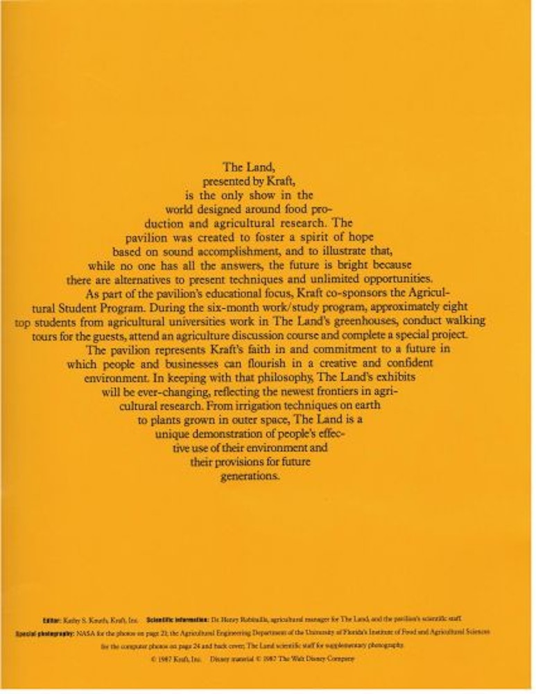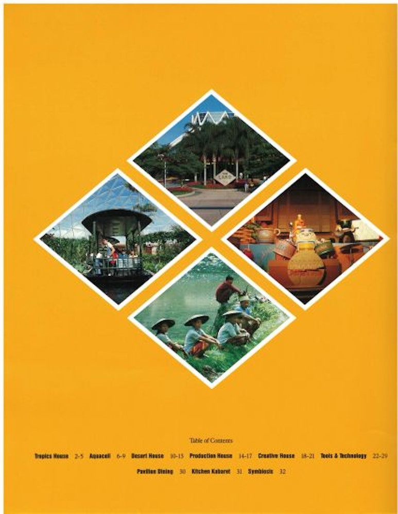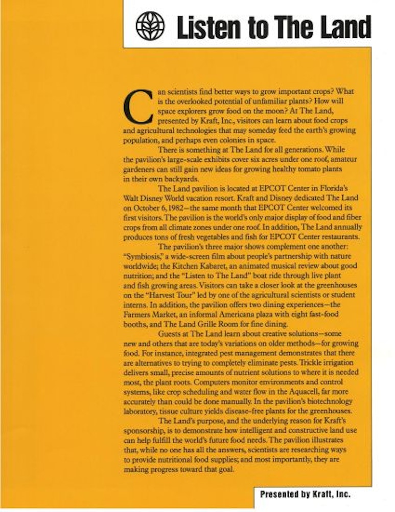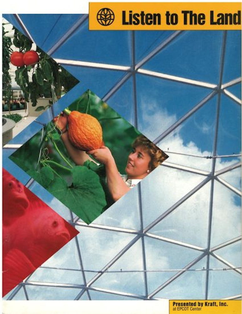 The introduction offers a brief overview of the various features of The Land in the 1980’s, including Listen to The Land, Kitchen Kabaret, Symbiosis, The Land Grille Room and the Farmers Market (known today as The Garden Grill and Sunshine Seasons, respectively). A fact of note is at the time, the pavilion was “the world’s only major display of food and fiber crops from all climate zones under one roof.”