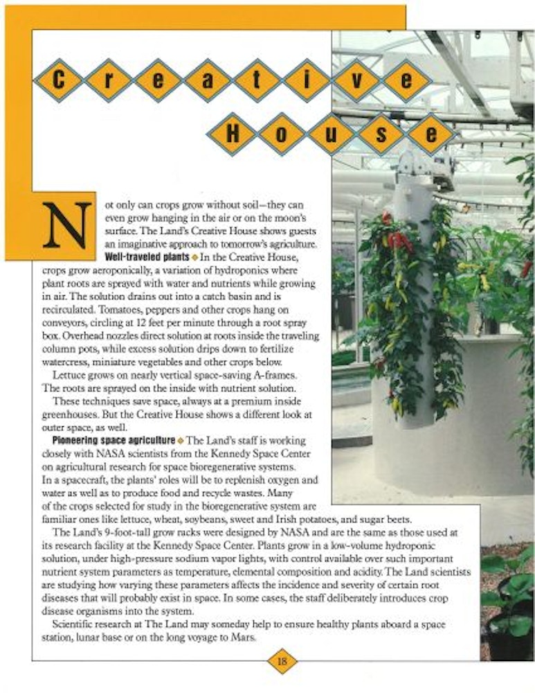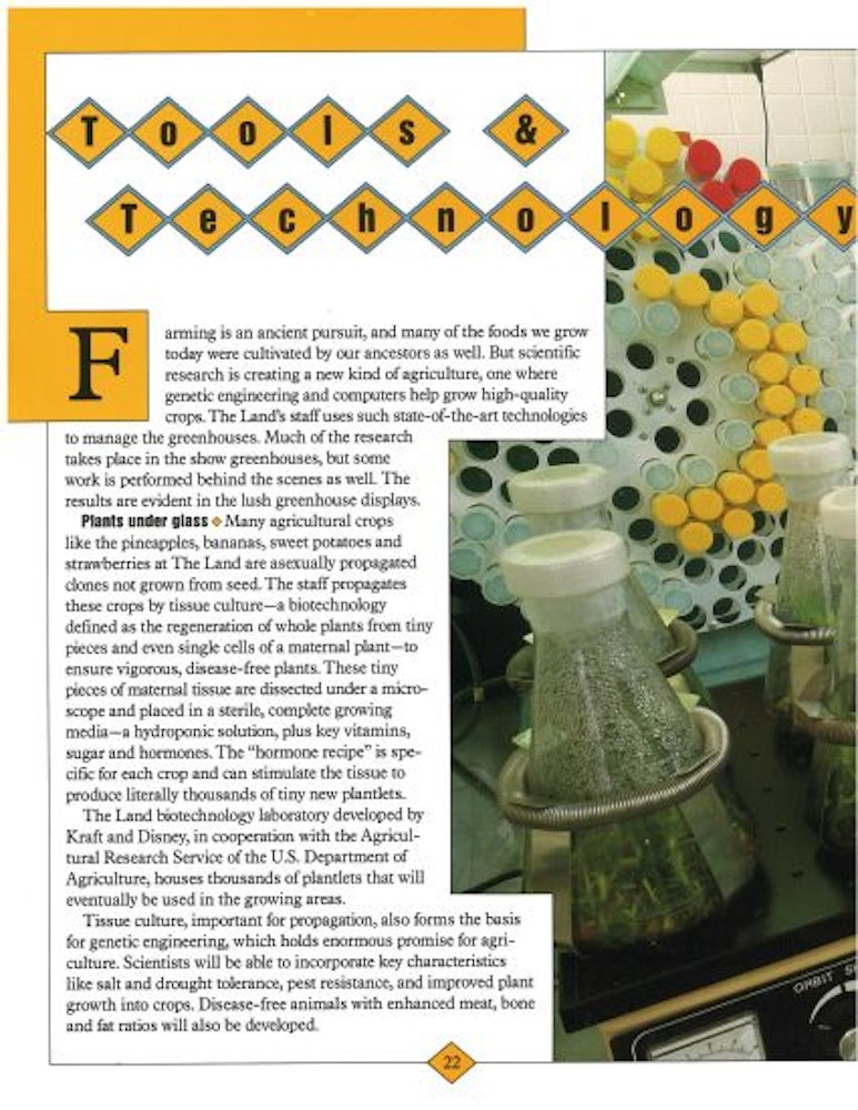 While that may be the end of the ride for guests, the tour in this booklet has just begun. There’s a deeper look into the technology and techniques used to farm in these greenhouses. This page discusses tissue culture, used to propagate asexual crops.
