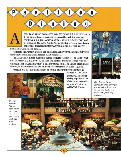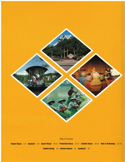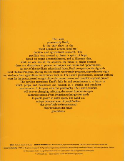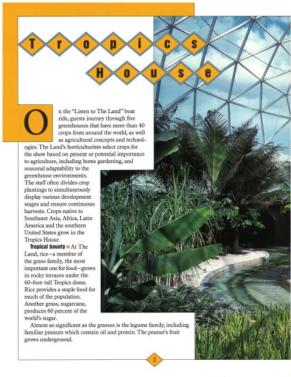 The introduction offers a brief overview of the various features of The Land in the 1980’s, including Listen to The Land, Kitchen Kabaret, Symbiosis, The Land Grille Room and the Farmers Market (known today as The Garden Grill and Sunshine Seasons, respectively). A fact of note is at the time, the pavilion was “the world’s only major display of food and fiber crops from all climate zones under one roof.”