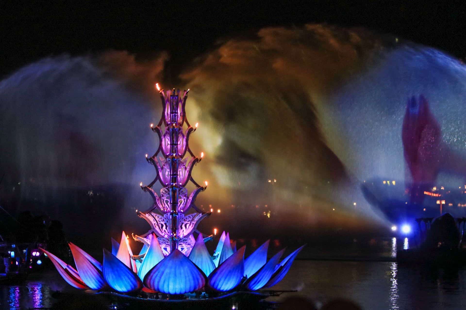 [Picture ID: One of the Rivers of Light floats shaped like a flower is lit up blue and pink. A large torch rising from the center of it has several small flames. Behind the float, projected on water, is the image of a realistic lion and an animated lion from The Lion King.]