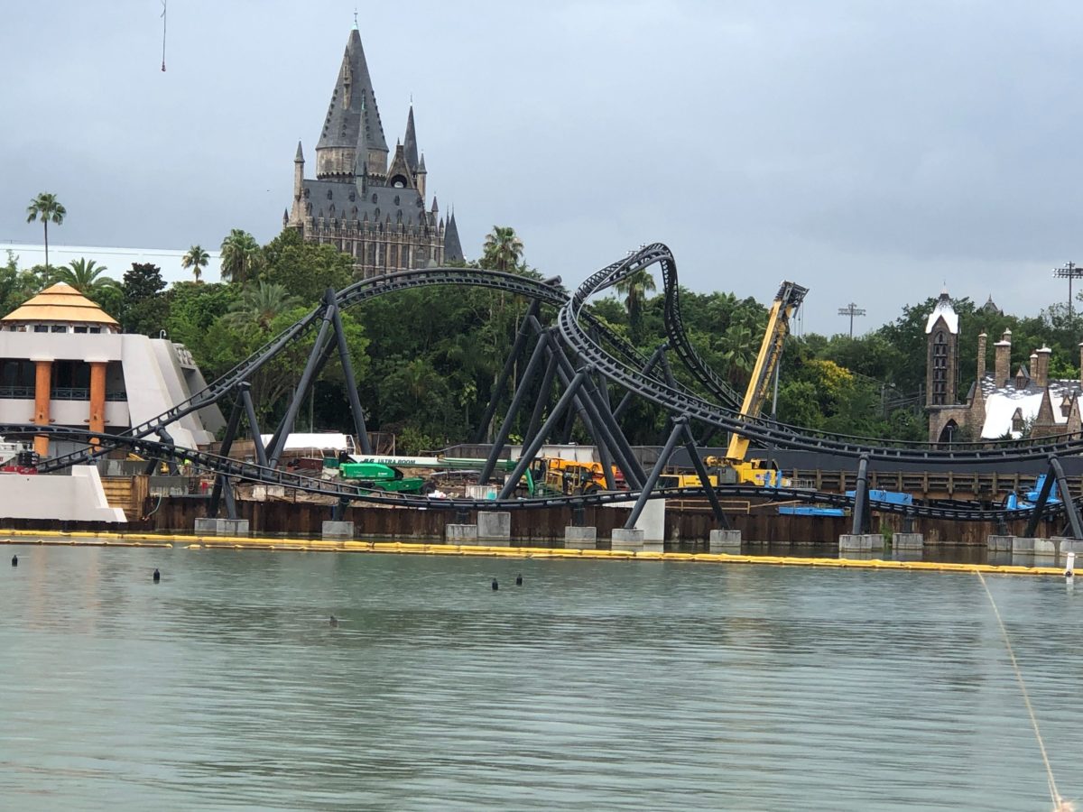The section will feature an inversion. Closer to Hogsmeade and Hogwarts, new track has been raised connecting the section over the water to the oscillating helix that take guests through twists and turns.