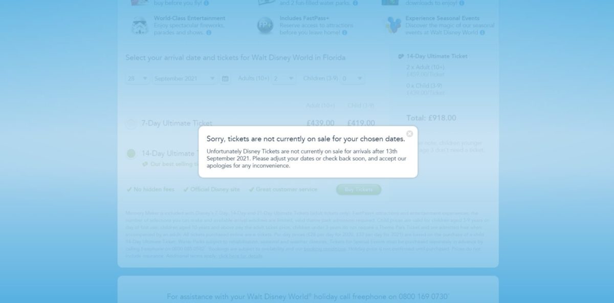 When trying to buy the tickets on the Walt Disney Travel Company’s UK website, guests are met with a message saying that tickets are not currently available for arrivals beyond September 13th, 2021. Disney has supposedly told UK-based travel agents that these tickets will not be made available following that date. If guests were to purchase the UK and Ireland-exclusive 14-day ticket beginning on the 13th, the final day of use would be the 26th, still days ahead of the official 50th on October 1st.