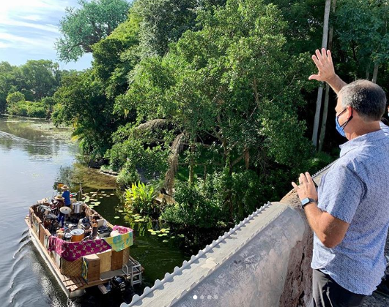 A photo from the bridge shows Cast Members on a boat on the water playing musical instruments, which is a part of the parks’ plan to allow characters to still interact with Guests throughout the day from a safe distance.
