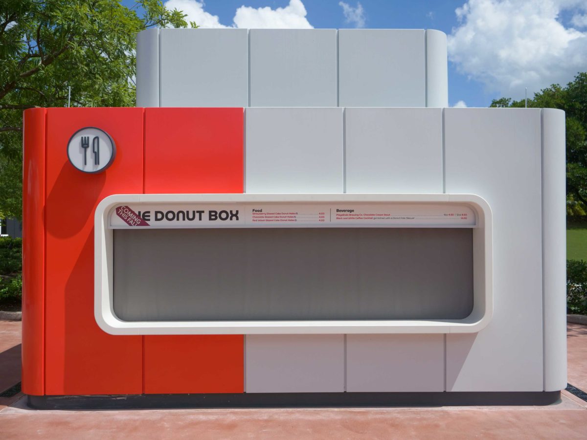 New signage has gone up at The Donut Box, which will be featuring a brand-new menu. The stand previously appeared at the 2019 Epcot International Food & Wine Festival, though it’s unknown if it will be part of this year’s Taste of EPCOT International Food & Wine Festival. Before the park-wide shutdown, this location had already been set up to debut as Taste Track Burgers & Fries following the planned closure of The Electric Umbrella, but it seems plans have changed for the brightly-lit kiosk.