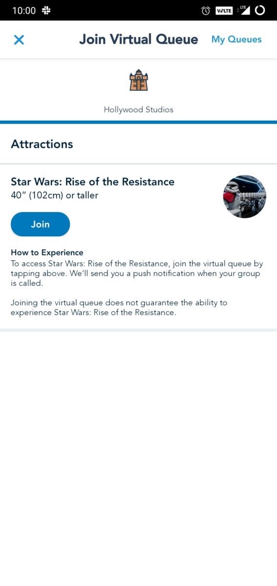 I was here in Studios before opening at 10. When then queue became available at 10 I tried to join. When I hit the join button at 10:00:01 it said the queue was full. That’s garbage. It’s difficult enough to get a park pass for studios. Then when you finally get in the reason you came is unavailable.