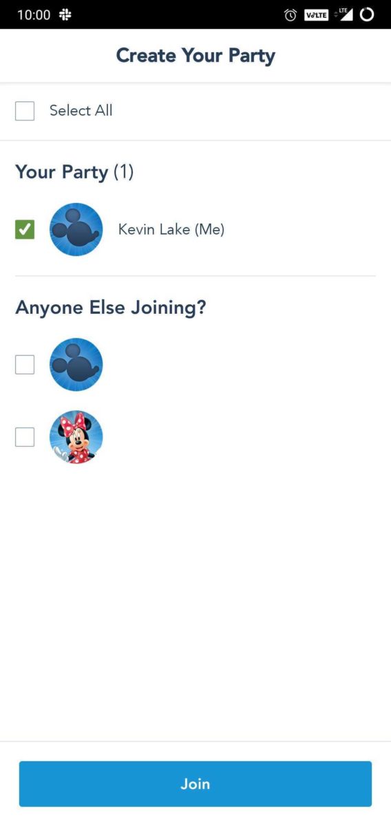 Once 10:00 AM (or 2:00 PM) rolls around, guests will want to refresh this screen by pulling down on it. As soon as Boarding Groups are live, a “Join” button will appear. Pressing that button will present a page to select who will be part of your party.