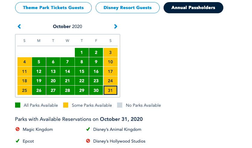As we approach the Fall season, we’re looking at varying availability at the parks in terms of reservations for guests with Theme Park Tickets, Disney Resort guests, and Annual Passholders. We’ve officially started seeing the first Disney Park Pass reservations go for the month of November, starting with the first Saturday of the month on November 7, which is currently fully booked for Annual Passholders at Disney’s Hollywood Studios.