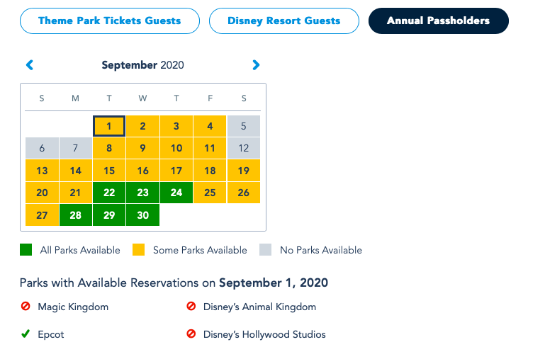 For Annual Passholders, September has yet to receive the blessing of replenished Park Pass availability. Because of this, you’re looking at very limited availability (i.e. mainly just EPCOT) and no availability at all on some weekends. There’s still some mid-week availability in the latter half of the month, however.