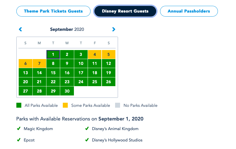 For Disney Resort hotel guests and guests with theme park tickets, we’ll only look at September, as it’s the only month impacted for these guests so far. As we’ve seen, Labor Day at Disney’s Hollywood Studios will be pretty packed, as no reservations are available for the entirety of the weekend and the Friday and Monday that bookend it, from September 4 to September 7.