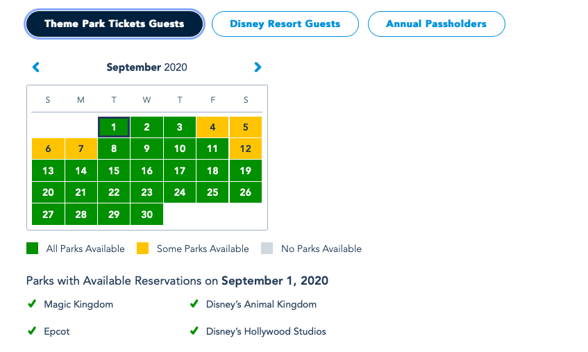 Guests with Theme Park Tickets not staying at resorts have even more limited options for Labor Day weekend. EPCOT and Disney’s Hollywood Studios are no longer available on Saturday, September 5, and then on Sunday, Disney’s Animal Kingdom and Disney’s Hollywood Studios are also no longer available. Disney’s Hollywood Studios is also booked on September 4, 7, and 12.