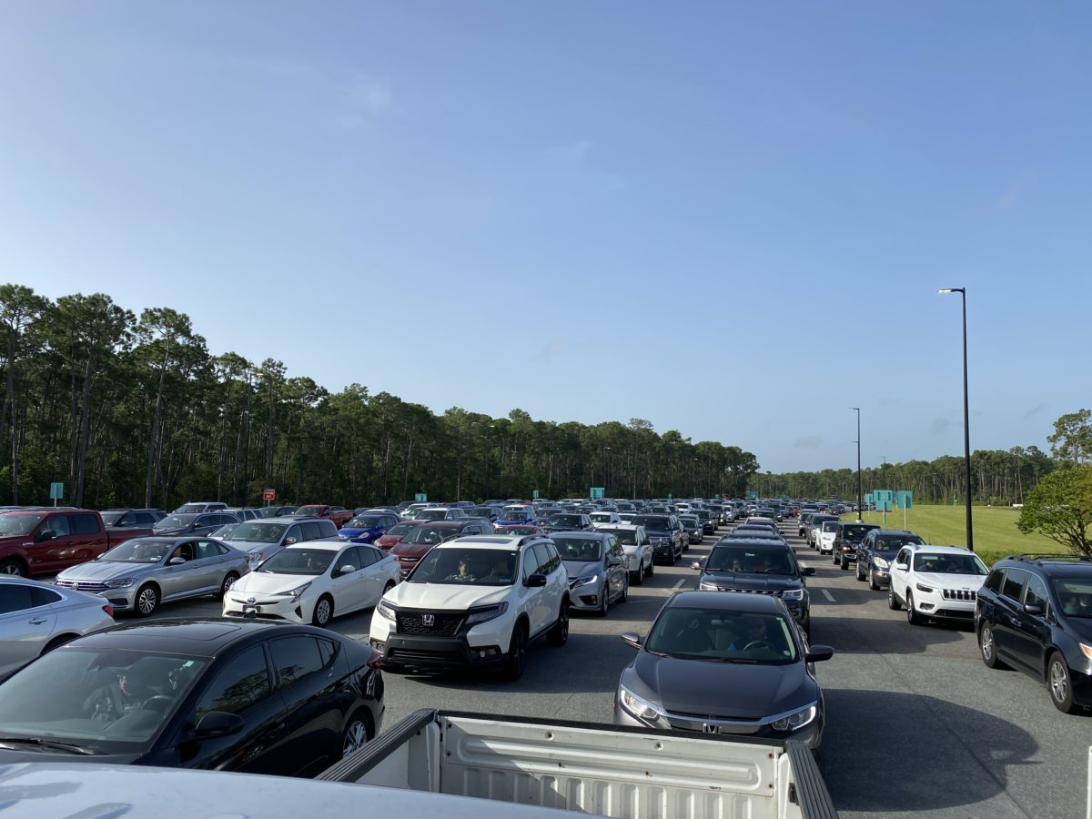 While we technically aren’t allowed to line up to park at the parking gate until 60 minutes prior to park opening time, we arrived a few minutes early and boy are we glad we did. It seems everyone else had the same idea, and when the two-lane road bottleneck area at the beginning of this multi-lane area fills with cars too fast, it seems that security doesn’t have much choice but to slowly open up this area to cars. Right after we took this picture, we were allowed in to the parking lot, even though we had not been held at the parking gate the standard full 15 minutes.