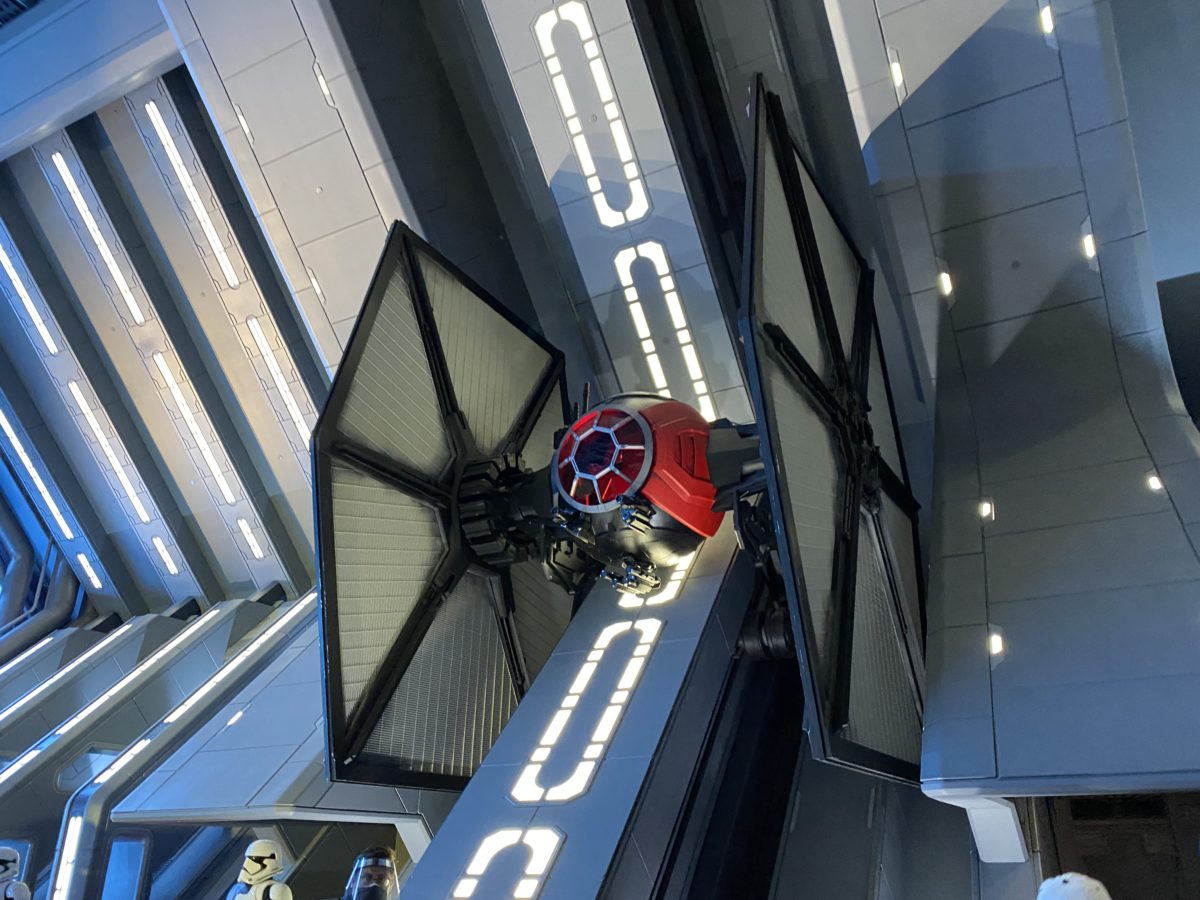 We took a moment to look up in a spot in Star Wars: Rise of the Resistance when most people are looking somewhere else and saw a TIE Fighter. This ride amazes us every time we ride it. It has been experiencing some technical difficulties recently, and unfortunately today was no exception. We experienced some audio drops today, but all other major components were functional. We’re just glad R5 is working again!