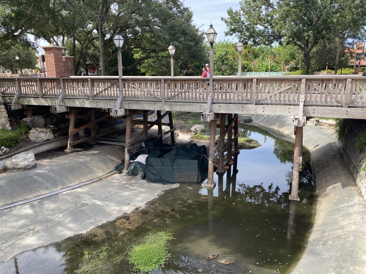 In the moat surrounding Cinderella Castle, the scrim wall that had been hung from the bridge hiding the legs, and construction supplies stored there, from view, is still stowed away with the supplies safely packed up. We also noticed the pumps on this side have either been turned off or have not been running as efficiently, as water has started to seep back in a bit.