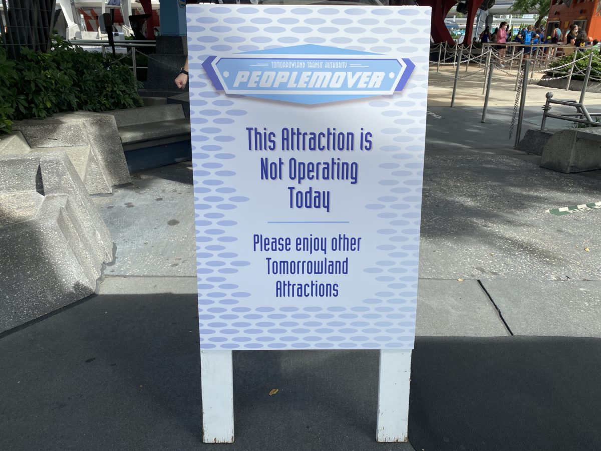 Over at the Tomorrowland Transit Authority PeopleMover the “not operating at this time” sign has been switched out for the “not operating today” sign, giving guests a bit more of a firm idea that the classic attraction will be unavailable long term.