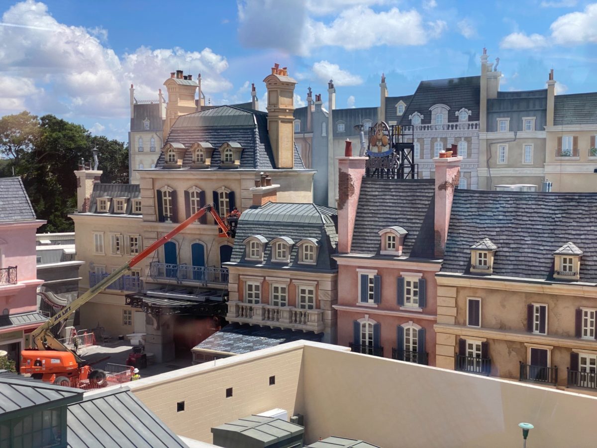 As we pass the attraction entrance for Remy’s Ratatouille Adventure, we can see workers putting the final touches on the building.