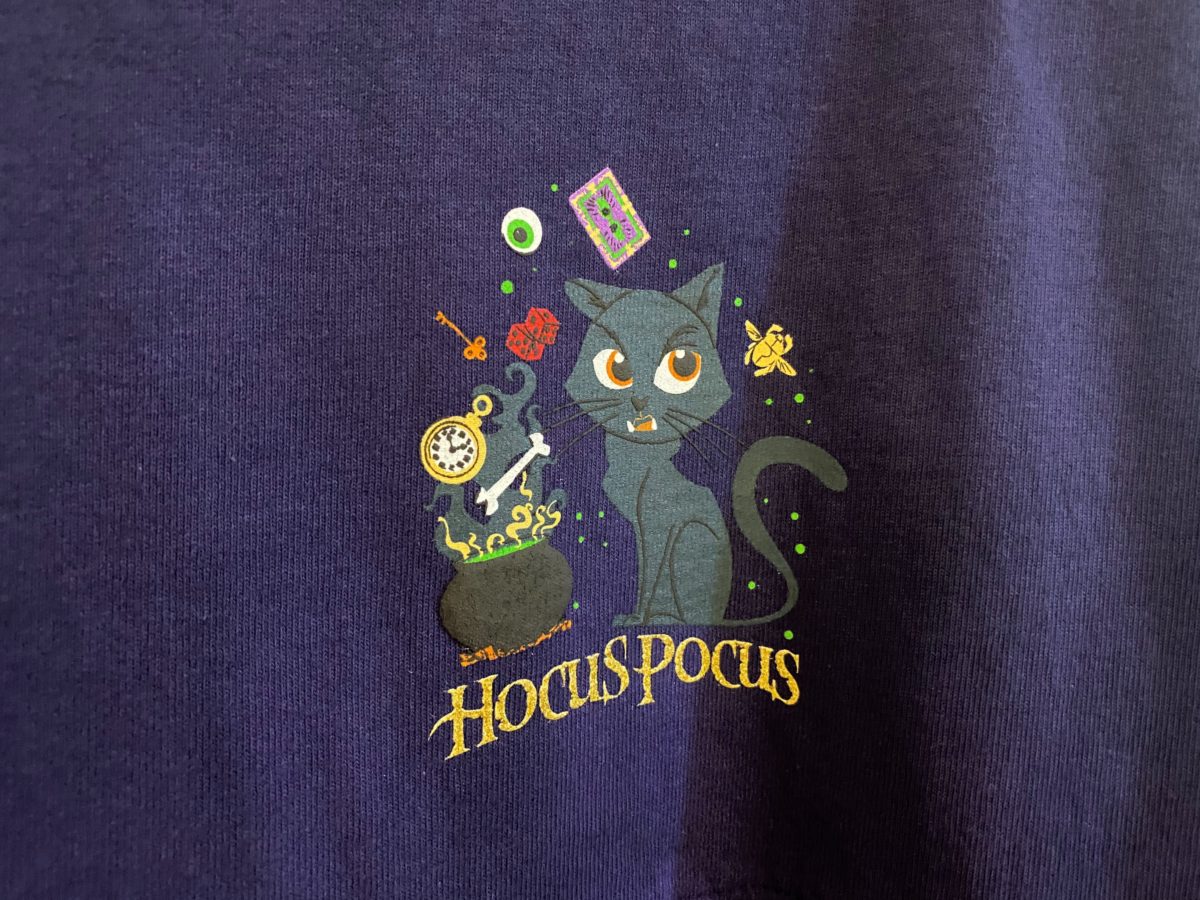 On the front of the shirt sits Thackery Binx, the boy-turned-cat who helps to foil the Sanderson Sisters’ plans. Surrounding Binx is a cauldron, a pocket watch, a bone, dice, a key, an eye, and oddly enough, one of Dr. Facilier’s tarot cards and the golden scarab from “Aladdin.”