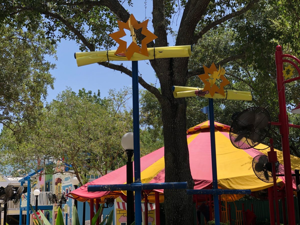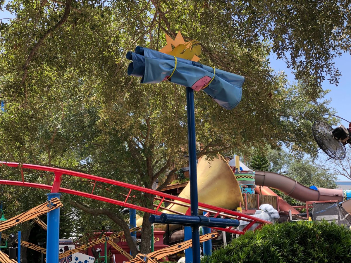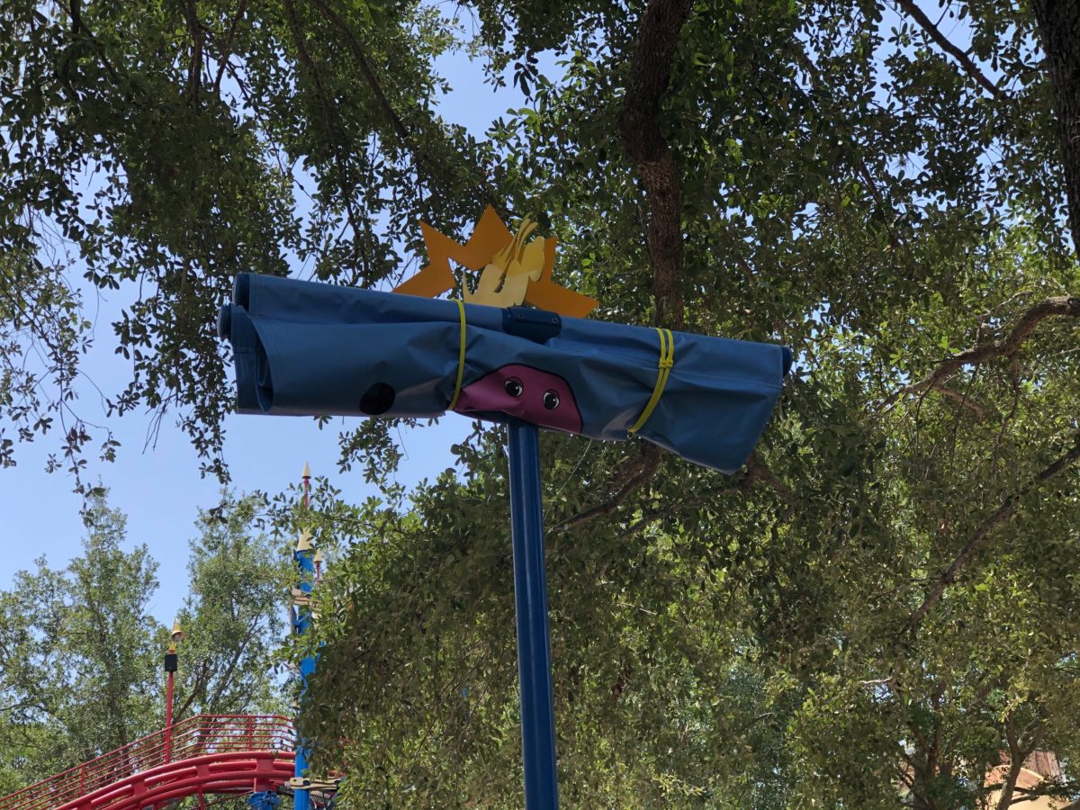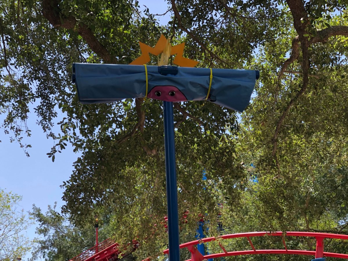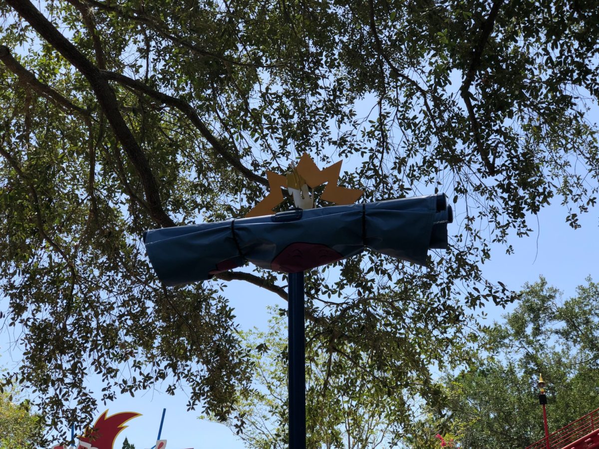 In Woody Woodpecker’s Kidzone, banners have been rolled up and secured on their poles.