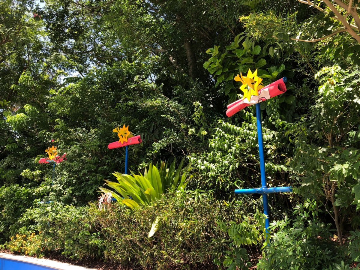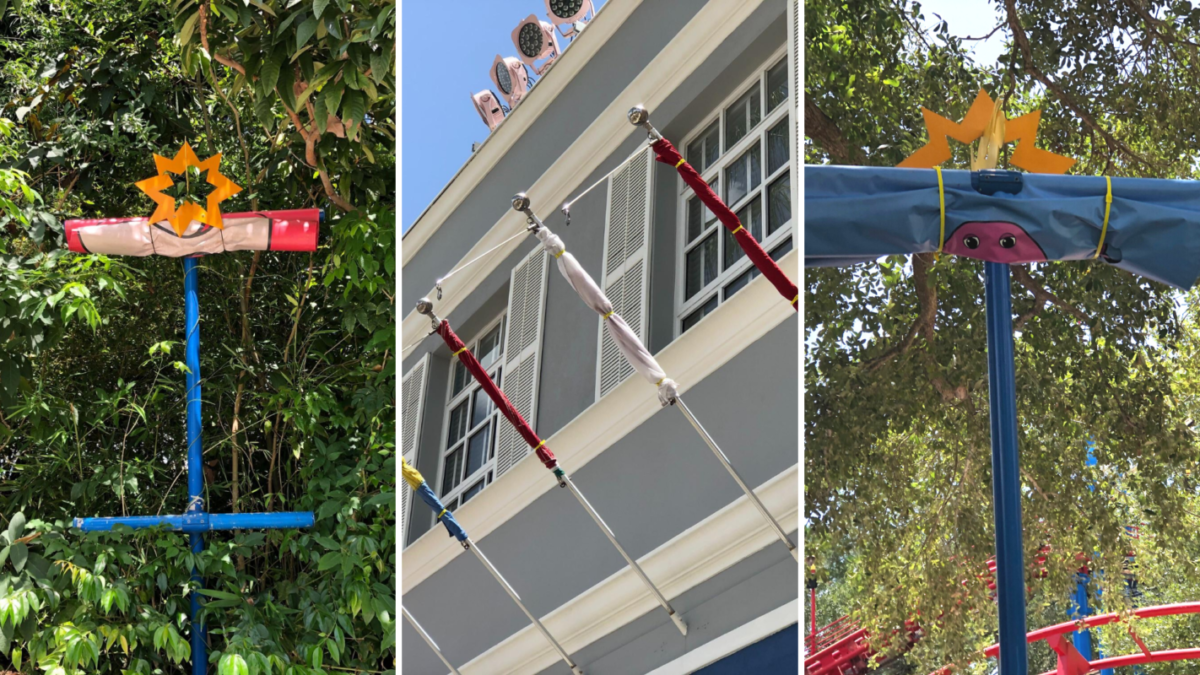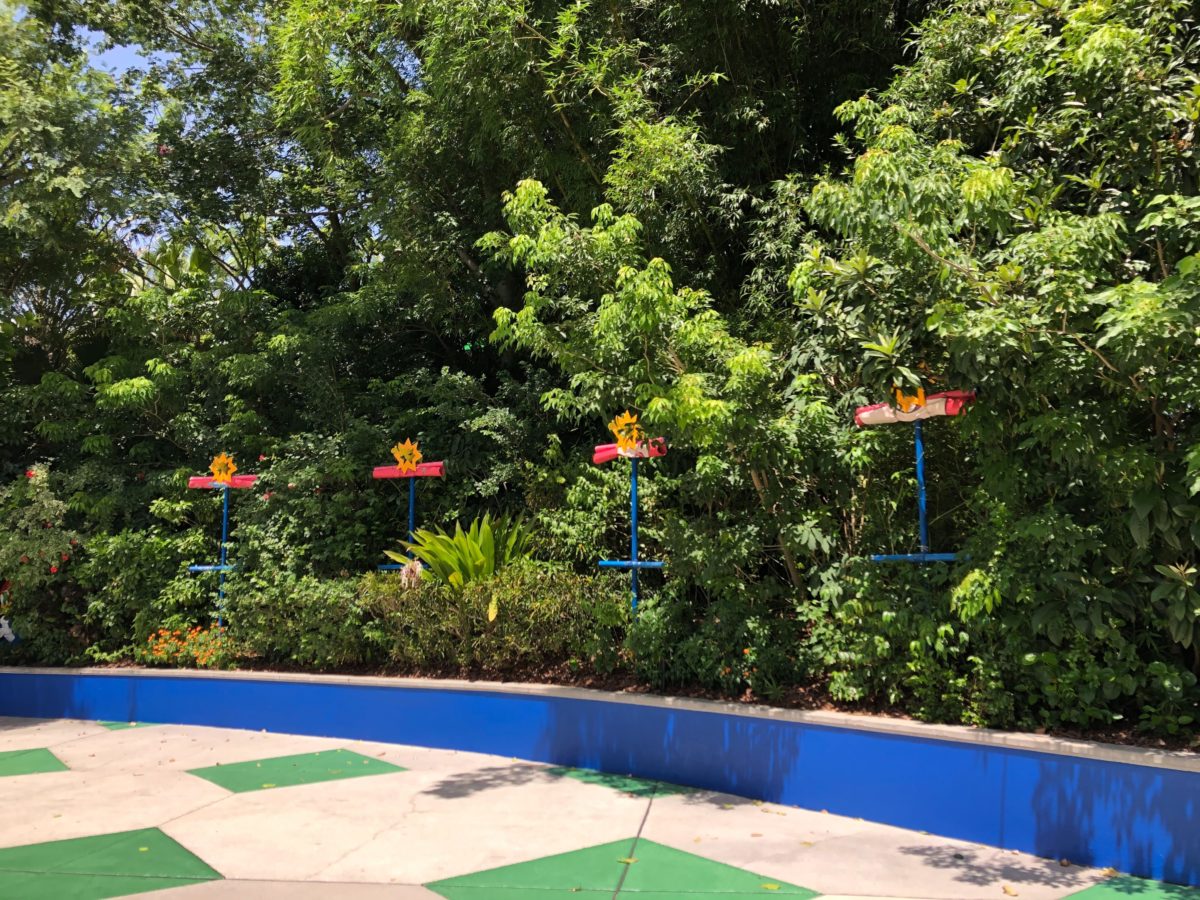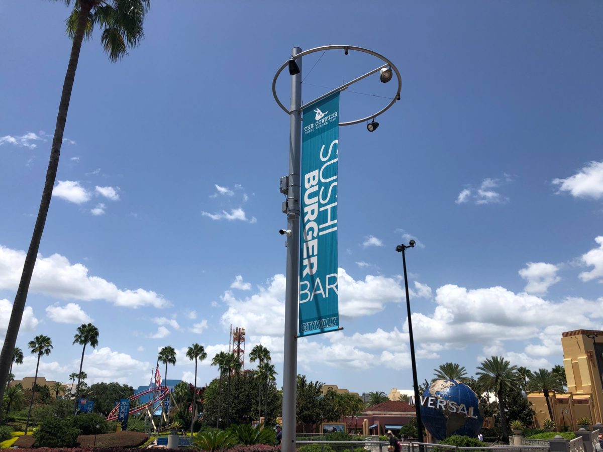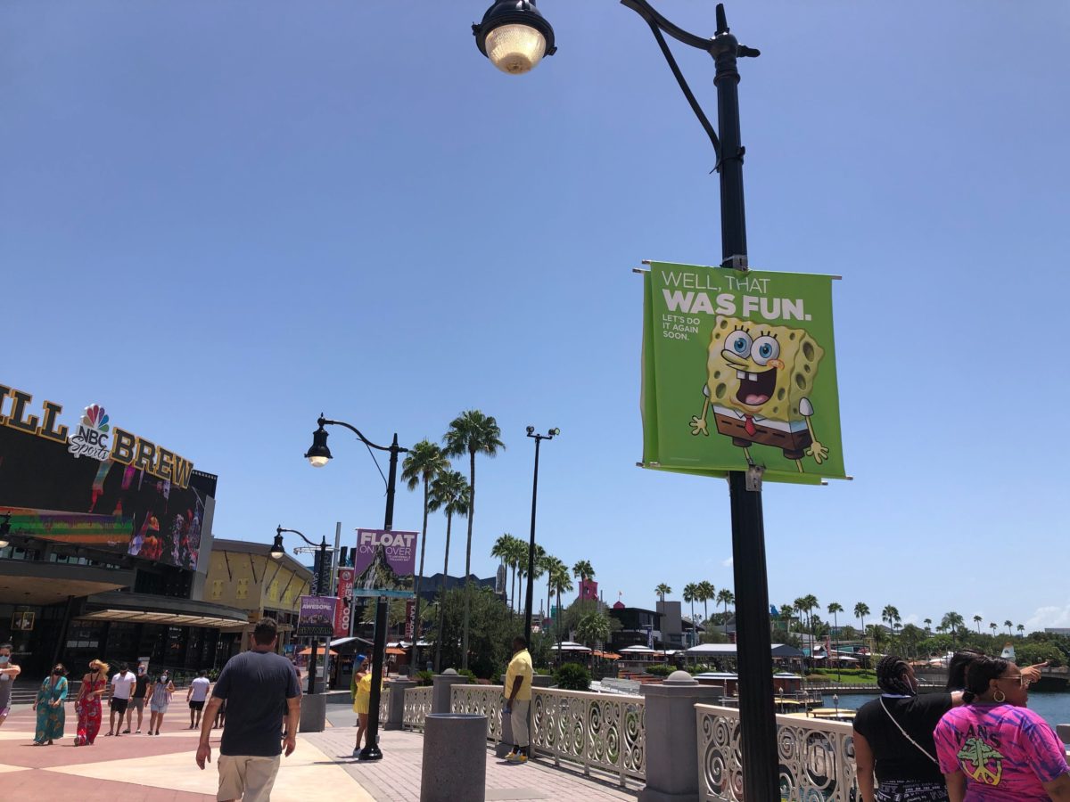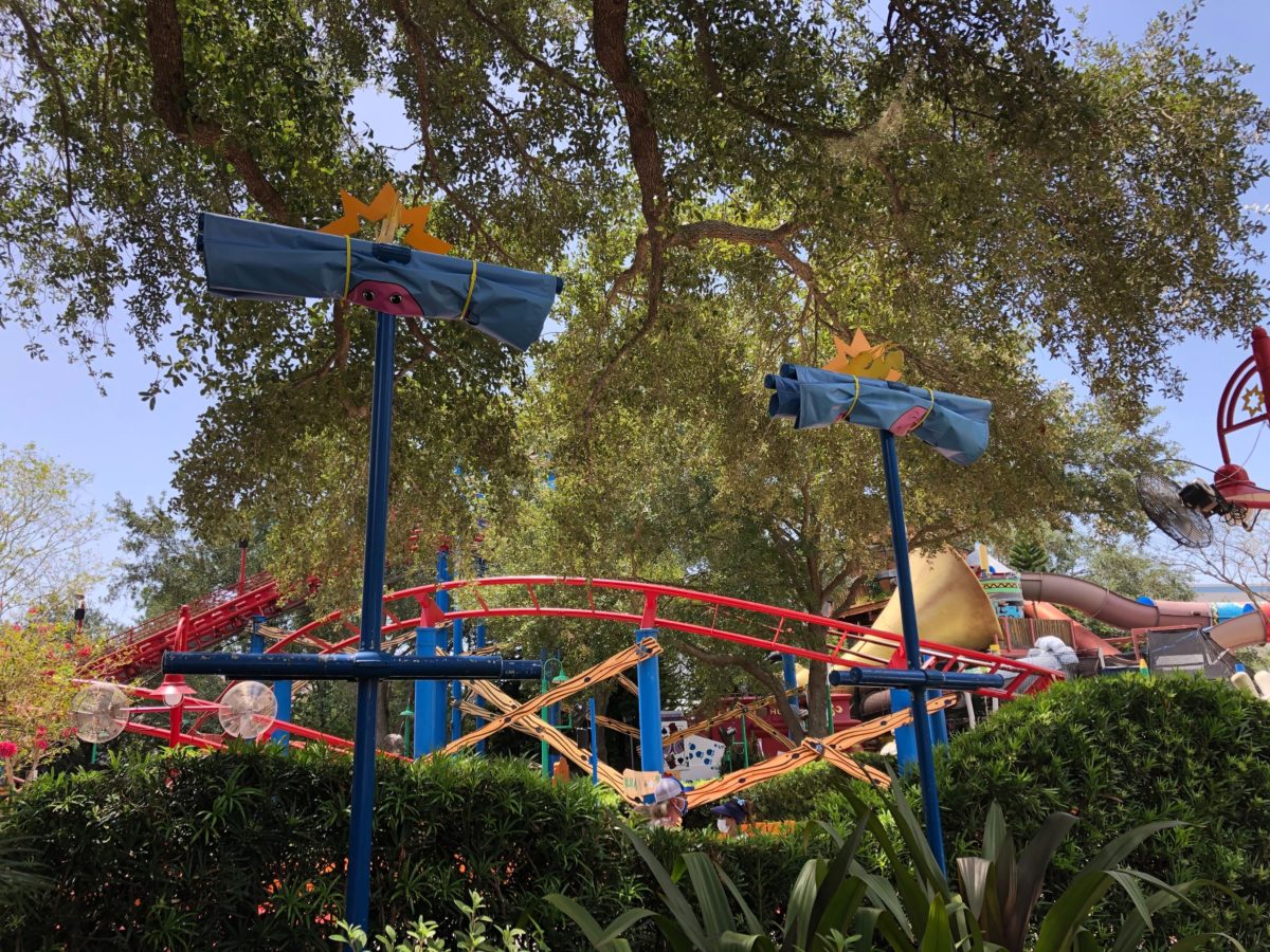 In Woody Woodpecker’s Kidzone, banners have been rolled up and secured on their poles.