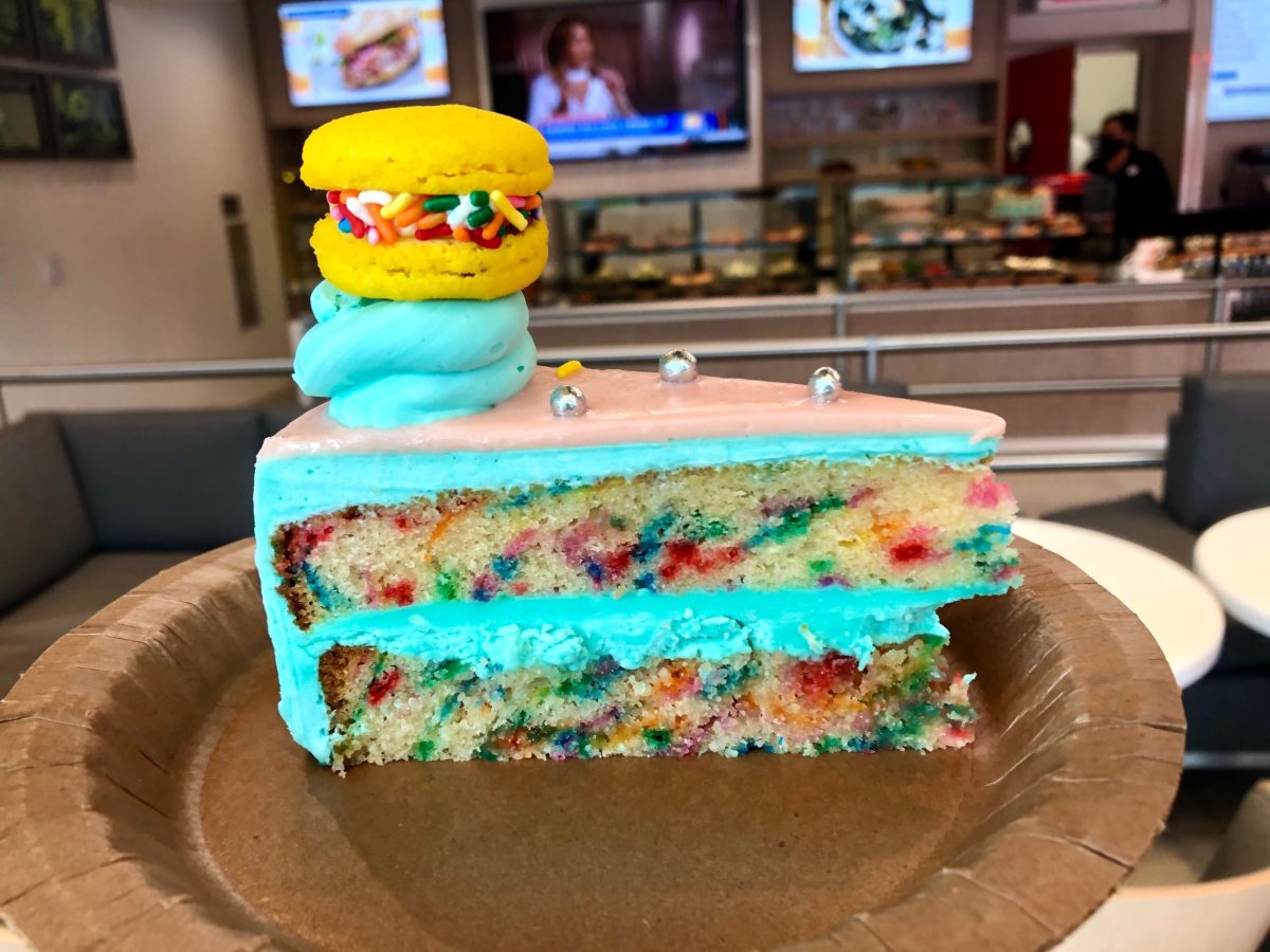 The TODAY Cafe, located just inside the entrance of Universal Studios Florida, is a great little spot to grab a variety of sandwiches, pastries, and desserts. We love to stop in and grab a quick sandwich, and we’ve had our eye on the confetti cake in the display case for a while. We finally gave in and decided to give it a try and find out if it tastes as good as it looks.