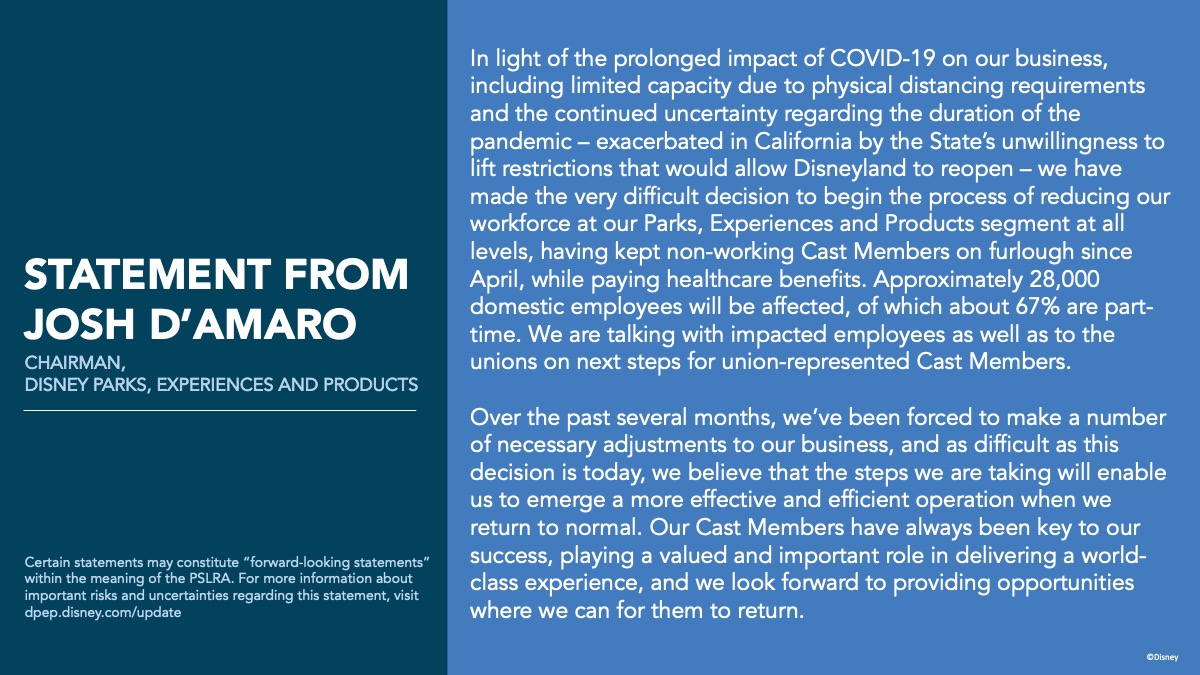 In light of the prolonged impact of COVID-19 on our business, including limited capacity due to physical distancing requirements and the continued uncertainty regarding the duration of the pandemic – exacerbated in California by the State’s unwillingness to lift restrictions that would allow Disneyland to reopen – we have made the very difficult decision to begin the process of reducing our workforce at our Parks, Experiences and Products segment at all levels, having kept non-working Cast Members on furlough since April, while paying healthcare benefits. Approximately 28,000 domestic employees will be affected, of which about 67% are part-time. We are talking with impacted employees as well as to the unions on next steps for union-represented Cast Members.
