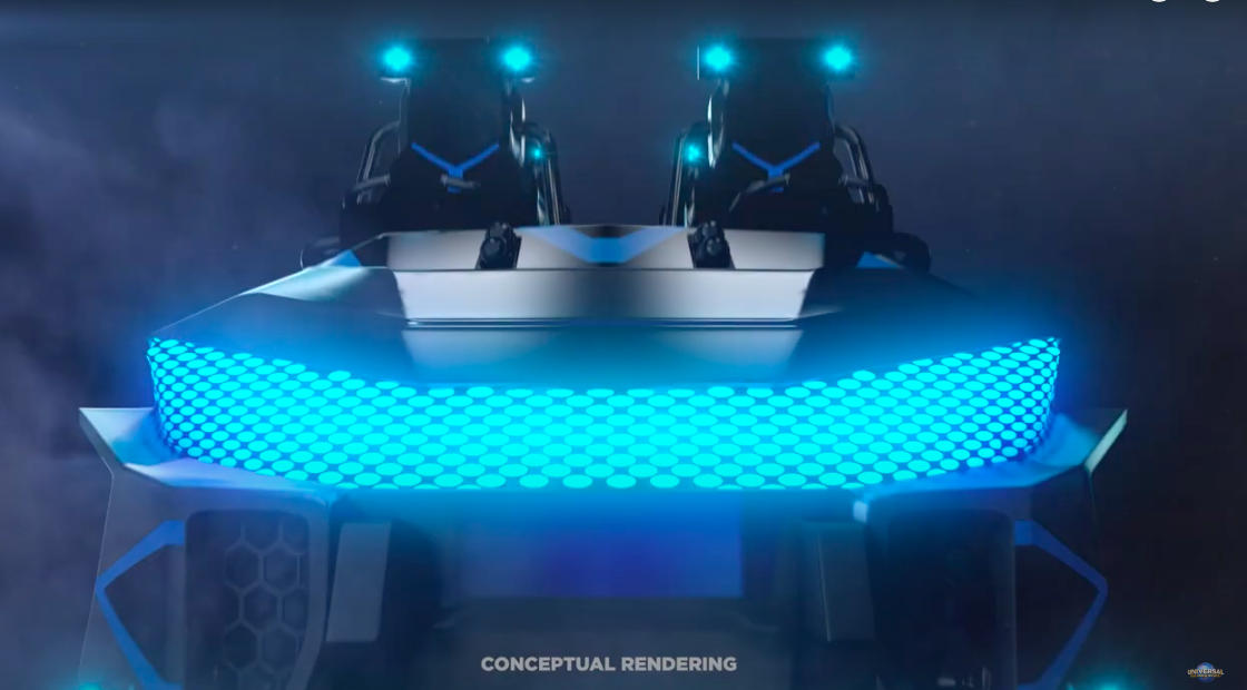 Here, we have a first look at the ride vehicles, which will feature the Jurassic World black and blue color scheme, with headlights at each seat.
