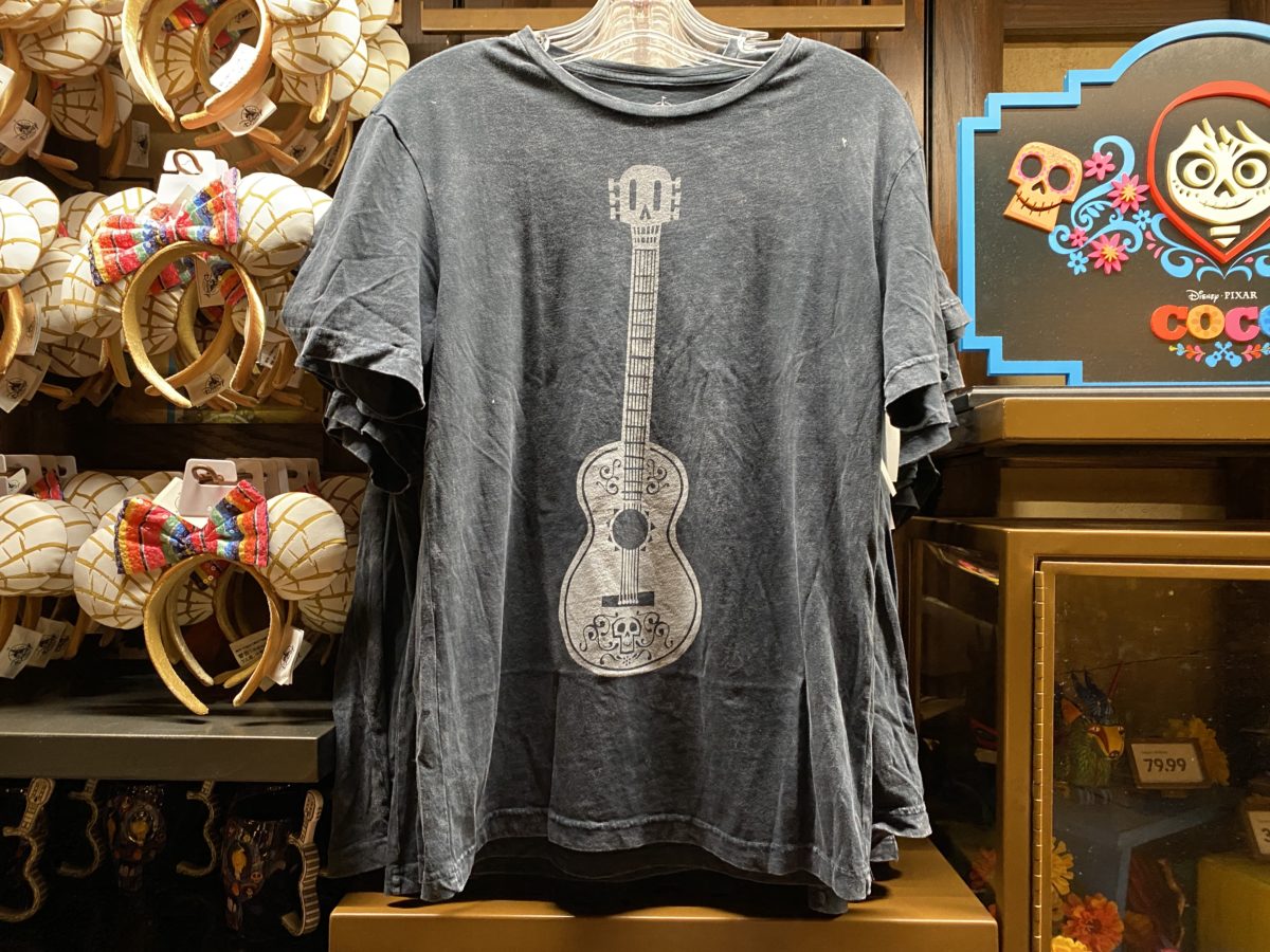 Traveling around World Showcase, we found this new adult unisex shirt in the Mexico Pavilion featuring the iconic guitar from Coco. It retails for $36.99.