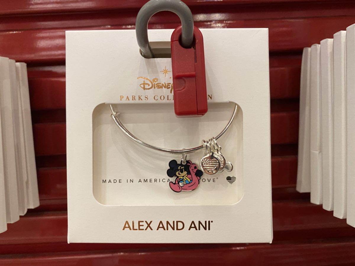 Now that you’ve got your new bag with your keychain, might as well complete the set and treat yourself to some new jewelry. This fun new Alex and Ani bangle popped up in Mouse Gear today a little late to the summertime fun pool party, but better late than never, right? This bracelet features Mickey in a flamingo pool float and retails for $49.99.