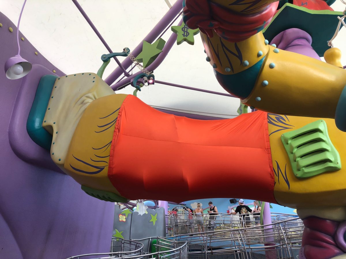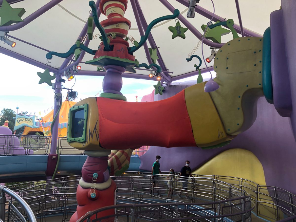 The High in the Sky Seuss Trolley Train ride also received some fresh new orange fabric over the Fix-It-Up Machine in the queue. When the park reopened in June, this was ripped and stained, and a few weeks ago we noticed there had been patches added over the holes. Now we’re happy to report that the fabric has been replaced, although it wasn’t moving at the time.