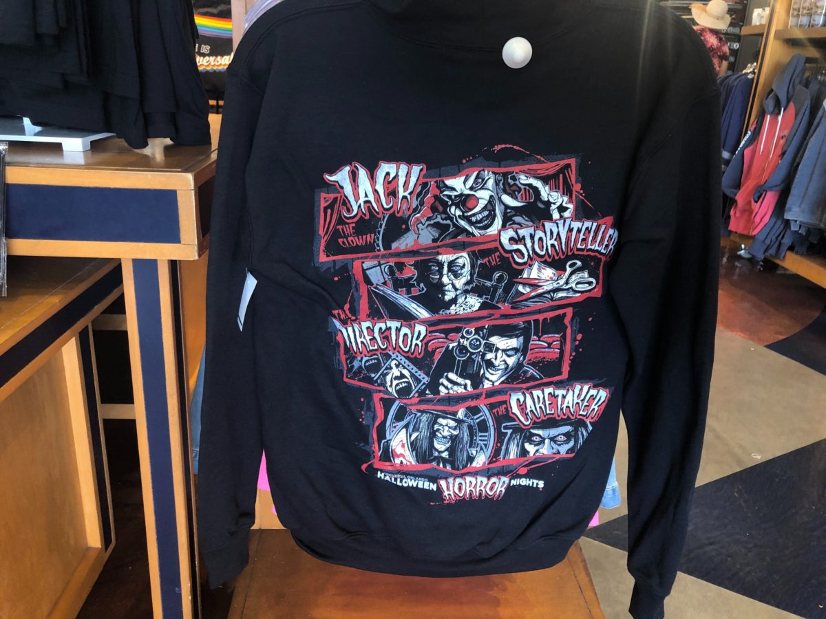 Stopping into the Universal Studios Store at the entrance of Universal Studios Florida, we discovered a new blacklight reactive hoodie featuring the Halloween Horror Nights Icons. This hoodie is available for $50 and can also be found in the Tribute Store.