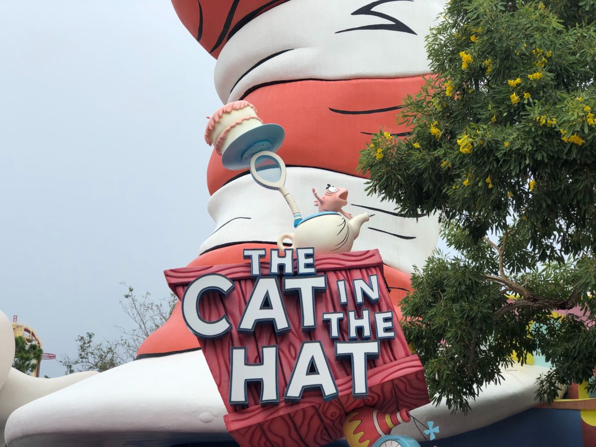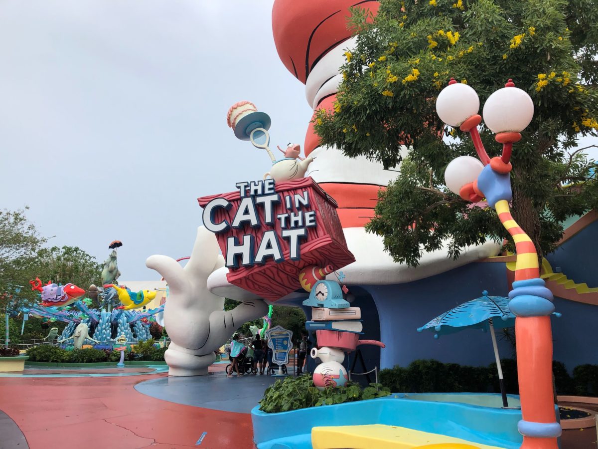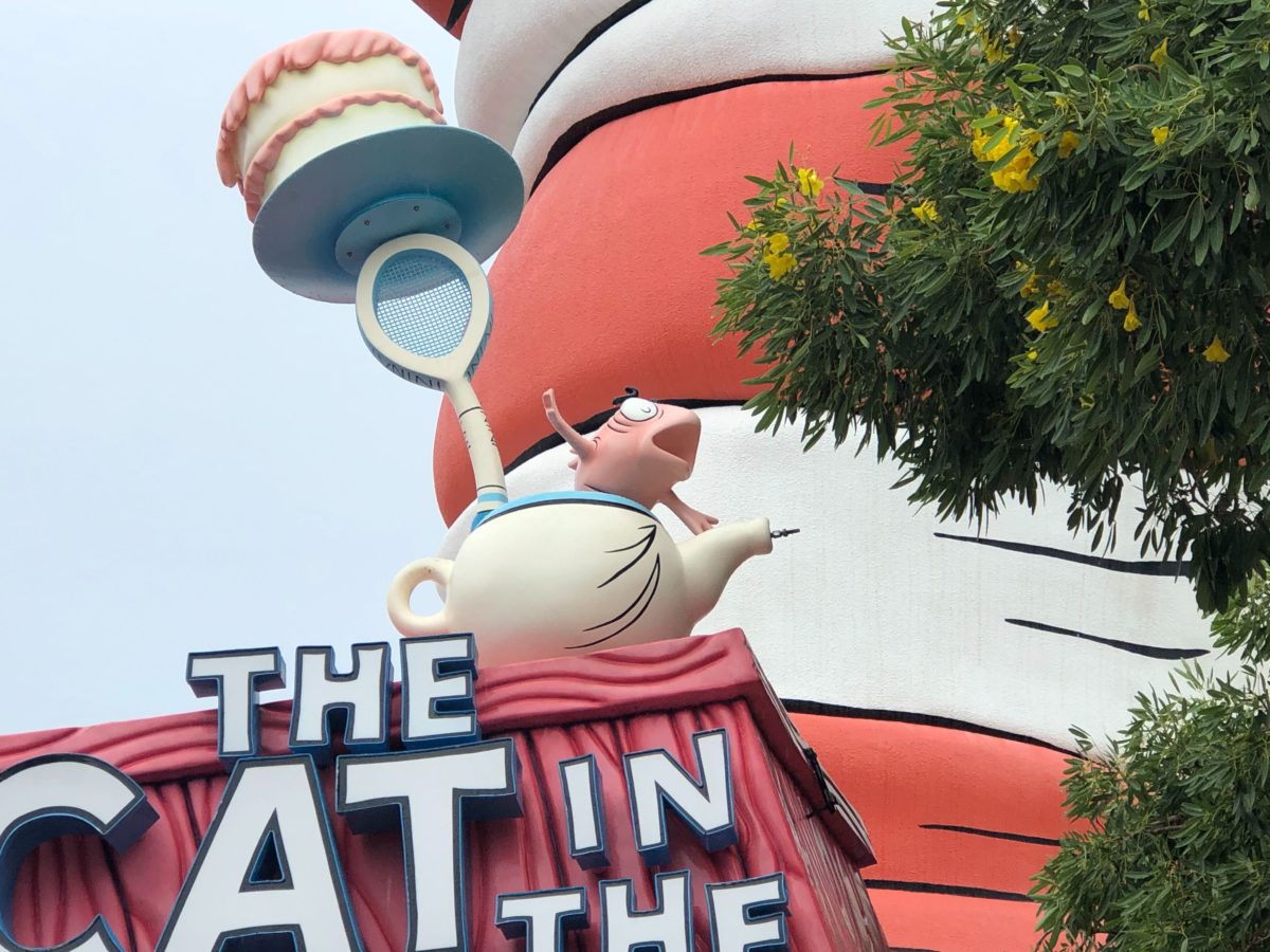 We’ve noticed some repairs around a few of the attractions in Seuss Landing recently. The fish in the tipping teapot over the entrance sign of The Cat in the Hat has been missing lately, but he has returned, and he moves again! This is a great sight and it caught our attention as soon as we entered the land.
