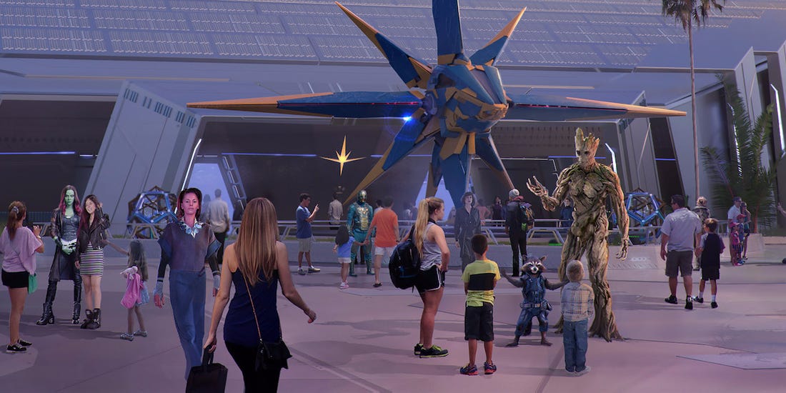 Initial concept art showed guests interacting with the likes of Groot and Rocket in the courtyard, and practically able to walk up to the spaceship, located on a low-lying pedestal. However, last year’s D23 Expo showed us that the spaceship would be on top of a slightly more elevated platform, the base of which would host a garden of space-like ferns.