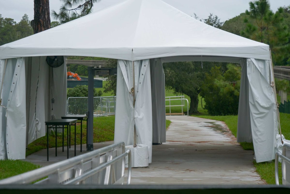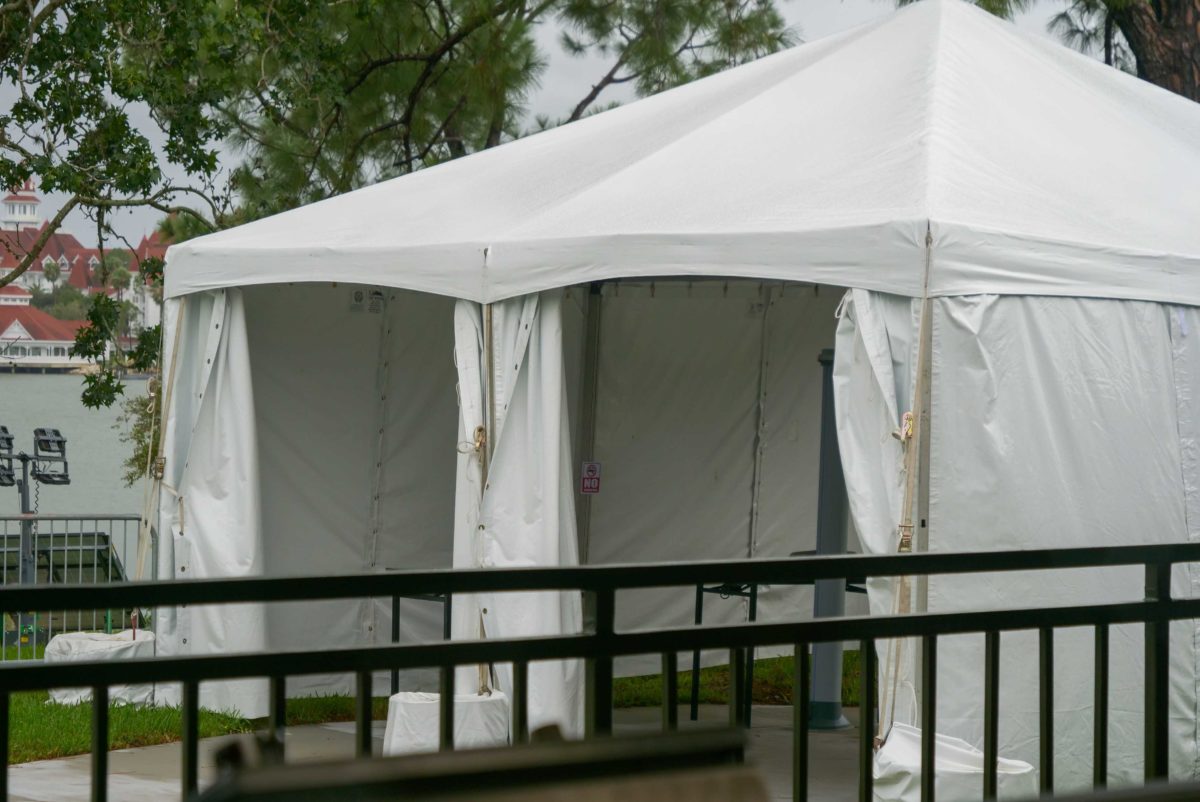 Nearby, we noticed the temperature checkpoint erected along the sidewalk walkway from Disney’s Grand Floridian & Spa to Magic Kingdom. It sits near the monorail station, but only temporarily. The checkpoint will migrate to the docks when construction has been completed.
