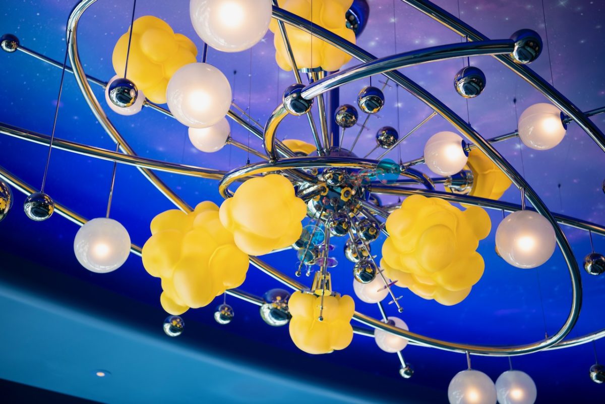 Above on the ceiling is a celestial design and a chandelier reminiscent of a galaxy, but with popcorn instead.