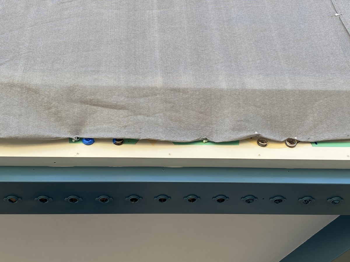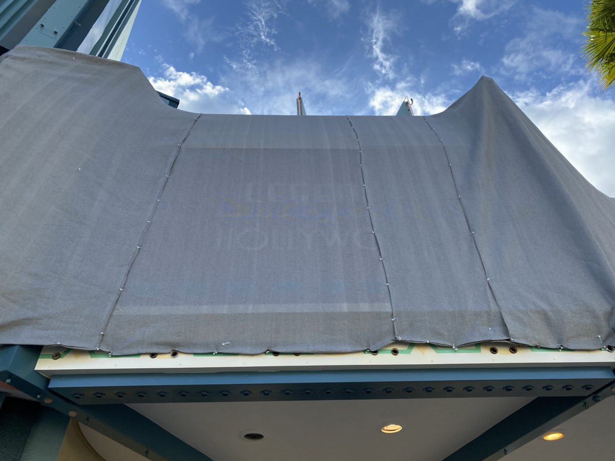 At Legends of Hollywood, while the sign is still legible under the scrim fabric, we saw some progress here. All of the wire used in attaching the neon to the frame was removed, and the scrim fabric was drilled directly into the wood of the sign.