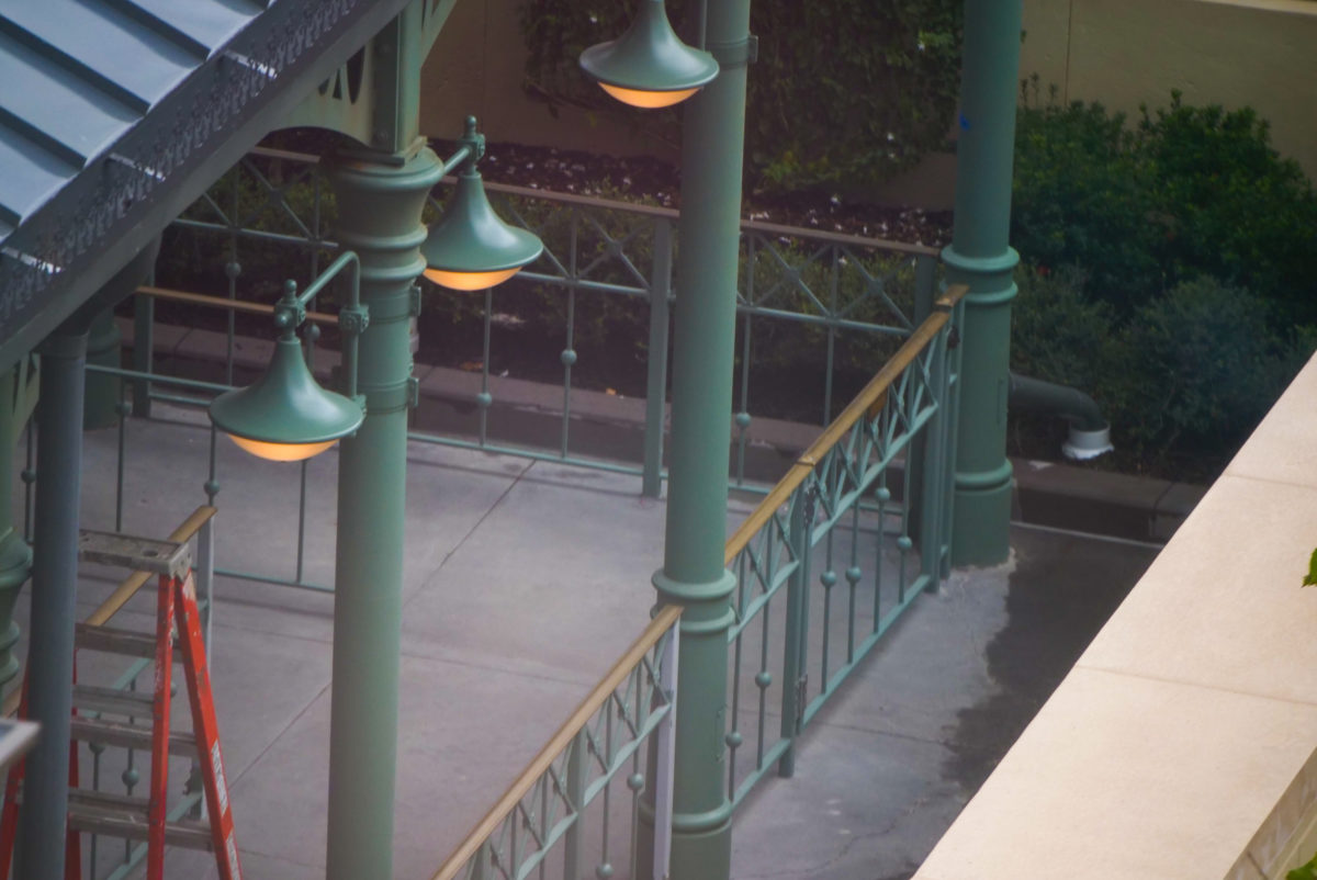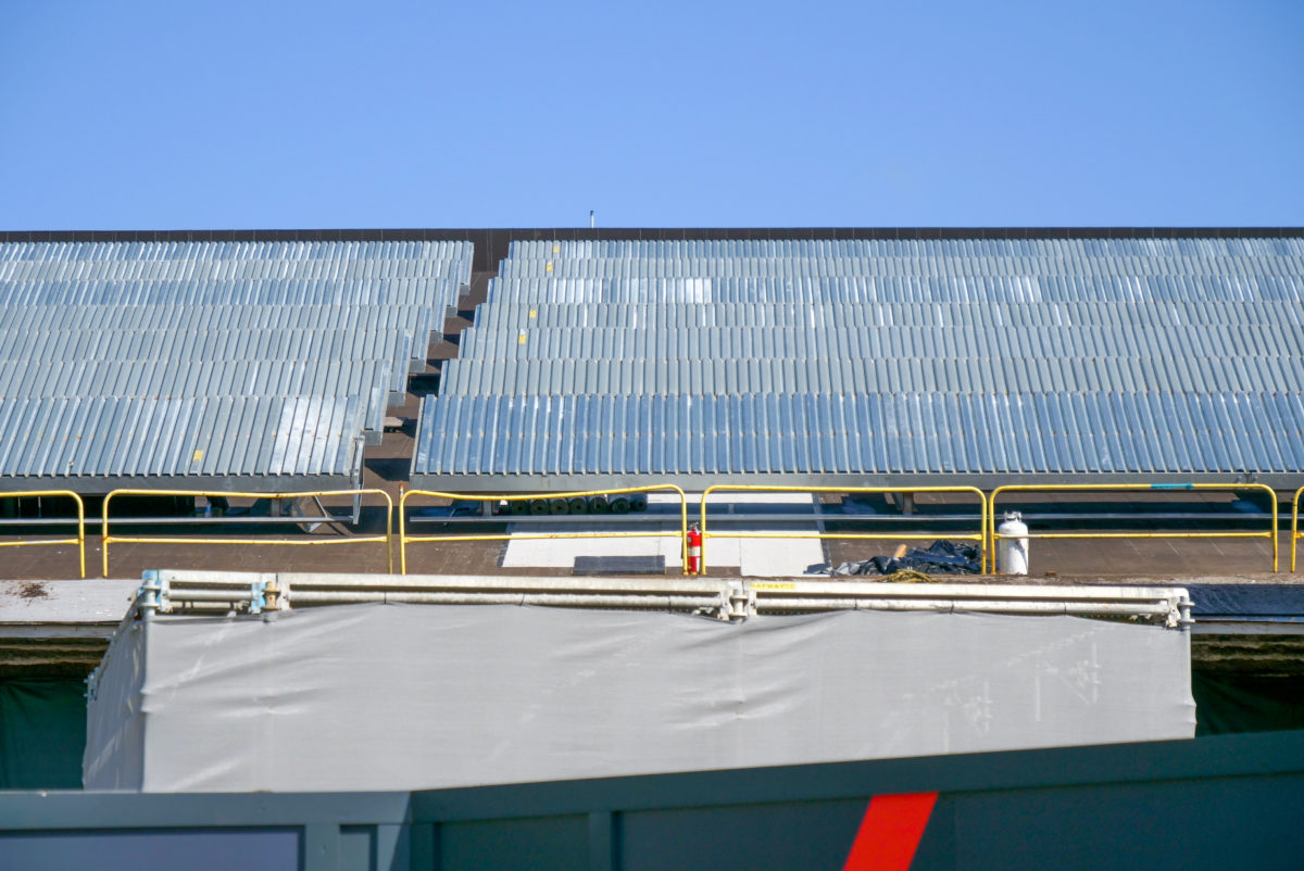 The neighboring Play! Pavilion is still blocked by walls as interior set work presses on, but most of the triangular roof panels have been replaced over the last few months as part of the pavilion’s overhaul.