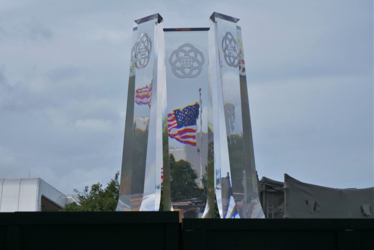 In the entrance plaza, work continues on the fountain remodeling project which is the final piece of the revamped lead-in to Spaceship Earth and the rest of the park. Scaffolding is still erected as a bridge over the fountain while the latter-stage details are added.