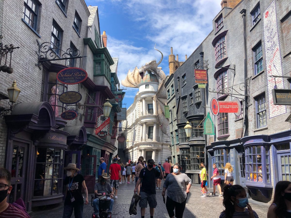 Diagon Alley isn’t too busy, but there are still plenty of people out enjoying the day.