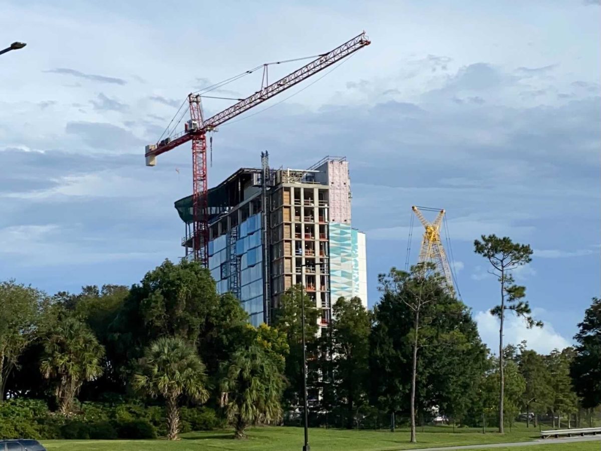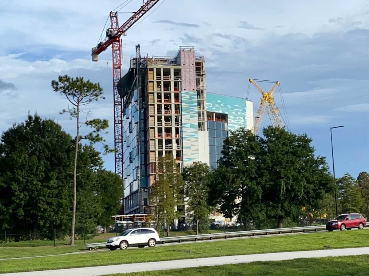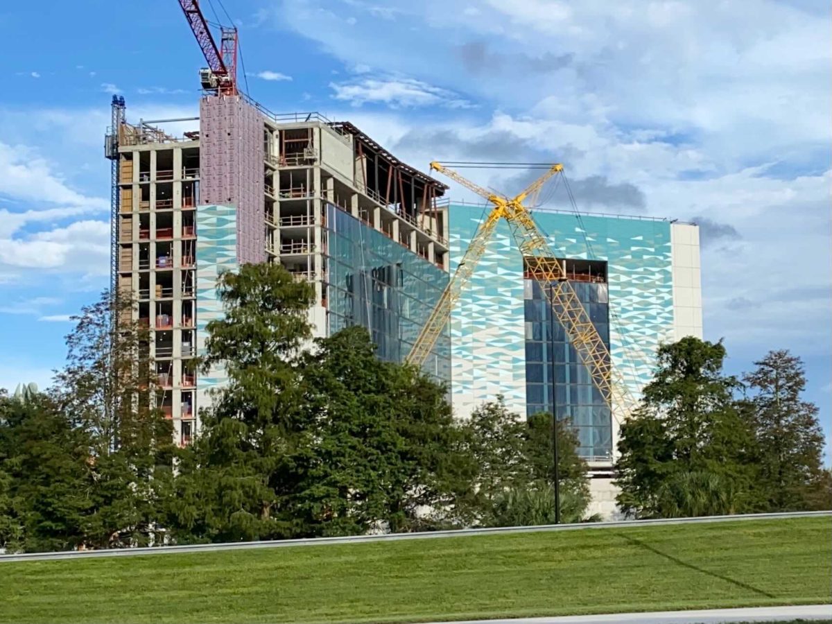 Construction of the newest hotel coming to the Swan and Dolphin complex progresses with the installation of more blue wave patterned paneling.
